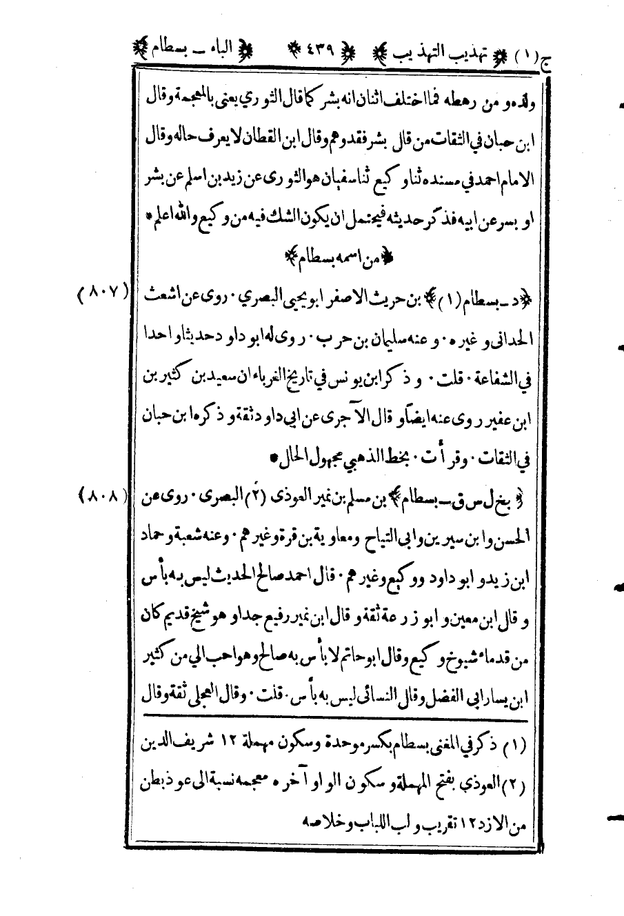 808 ـ "بخ ل س ق - بسطام" بن مسلم بن نمير العوذي2 البصري. روى عن الحسن وابن سيرين وأبي التياح ومعاوية بن قرة وغيرهم. وعنه شعبة وحماد بن زيد وأبو داود ووكيع وغيرهم. قال أحمد: "صالح الحديث ليس به بأس" وقال ابن معين وأبو زرعة: "ثقة" وقال ابن نمير: "رفيع جدا وهو شيخ قديم كان من قدماء شيوخ وكيع" وقال أبو حاتم: "لا بأس به صالح وهو أحب إلي من كثير بن يسار أبي الفضل" وقال النسائي: "ليس به بأس". قلت: وقال العجلي "ثقة" وقال