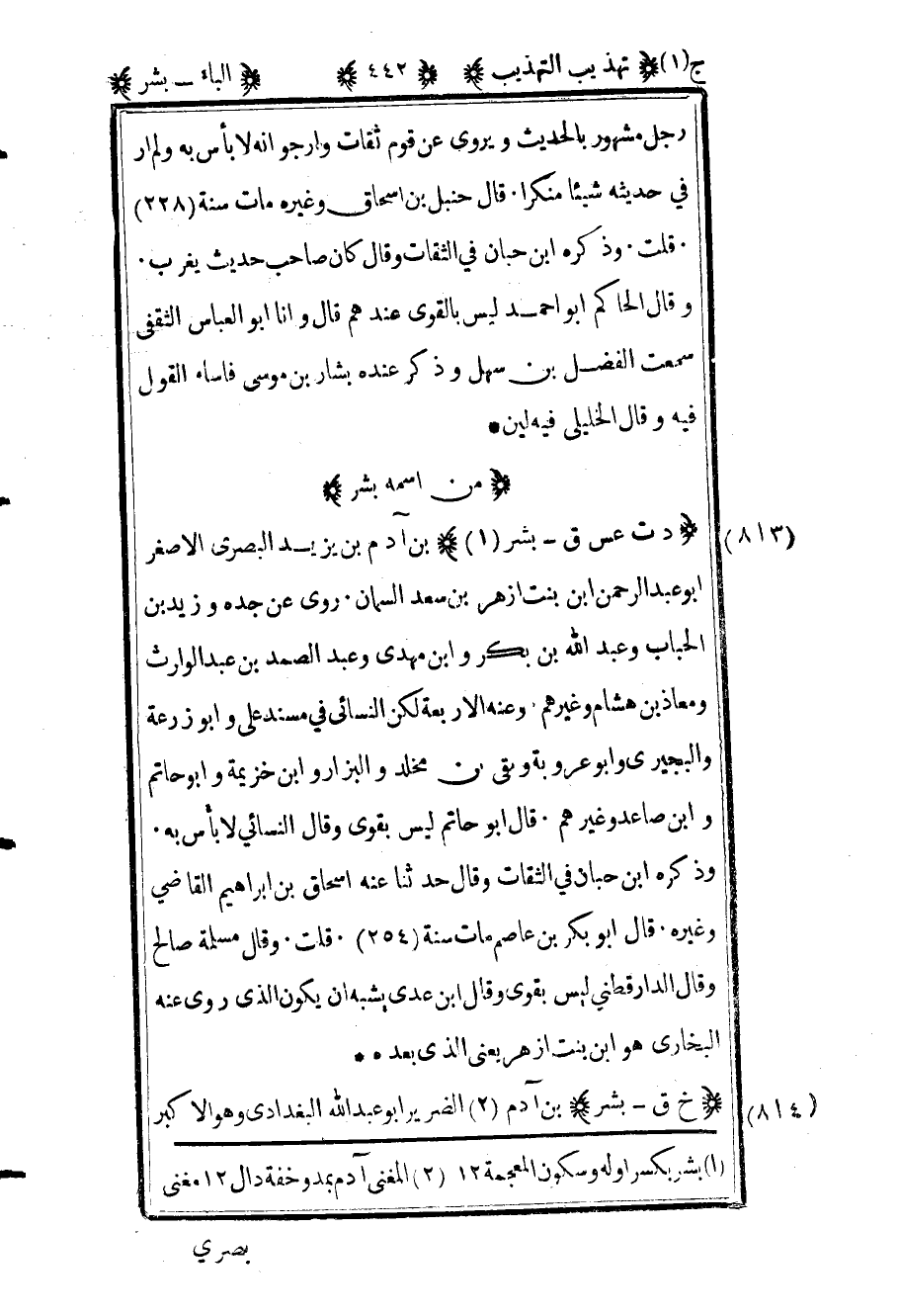 813 ـ "د ت عس ق - بشر1" بن آدم بن يزيد البصري الأصغر أبو عبد الرحمن ابن بنت أزهر بن سعد السمان. روى عن جده وزيد بن الحباب وعبد الله بن بكر وابن مهدي وعبد الصمد بن عبد الوارث ومعاذ ابن هشام وغيرهم. وعنه الأربعة لكن النسائي في مسند علي وأبو زرعة والبجيري وأبو عروبة وبقي بن مخلد والبزار وابن خزيمة وأبو حاتم وابن صاعد وغيرهم. قال أبو حاتم: "ليس بقوي" وقال النسائي: "لا بأس به" وذكره ابن حبان في الثقات وقال حدثنا عنه إسحاق بن إبراهيم القاضي وغيره. قال أبو بكر بن عاصم مات سنة "254". قلت: وقال مسلمة "صالح" وقال الدارقطني: "ليس بقوي" وقال ابن عدي: يشبه أن يكون الذي روى عنه البخاري هو ابن بنت أزهر يعني الذي بعده.