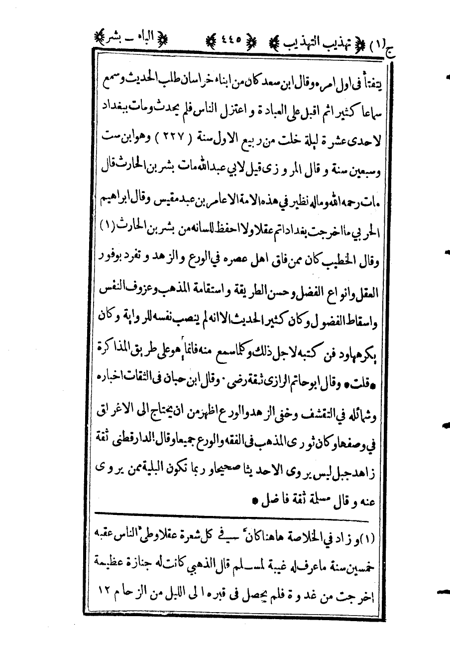 يتفتأ في أول أمره وقال ابن سعد: "كان من أبناء خراسان طلب الحديث وسمع سماعا كثيرا ثم أقبل على العبادة واعتزل الناس فلم يحدث" ومات ببغداد لإحدى عشرة ليلة خلت من ربيع الأول سنة "227" وهو ابن ست وسبعين سنة وقال المروزي قيل لأبي عبد الله مات بشر بن الحارث قال: "مات -رحمه الله- وما له نظير في هذه الأمة إلا عامر بن عبد مقيس" وقال إبراهيم الحربي: "ما أخرجت بغداد أتم عقلا ولا أحفظ للسانه من بشر بن الحارث"1 وقال الخطيب: "كان ممن فاق أهل عصره في الورع والزهد وتفرد بوفور العقل وأنواع الفضل وحسن الطريقة واستقامة المذهب وعزوف النفس واسقاط الفضول وكان كثير الحديث إلا أنه لم ينصب نفسه للرواية وكان يكرهها ودفن كتبه لأجل ذلك وكلما سمع منه فإنما هو على طريق المذاكرة". قلت: وقال أبو حاتم: "الرازي ثقة رضي" وقال ابن حبان في الثقات: "أخباره وشمائله في التقشف وخفي الزهد والورع أظهر من أن يحتاج إلى الاغراق في وصفها وكان ثوري المذهب في الفقه والورع جميعا" وقال الدارقطني: "ثقة زاهد جبل ليس يروي إلا حديثا صحيحا وربما تكون البلية ممن يروي عنه" وقال مسلمة: "ثقة فاضل".