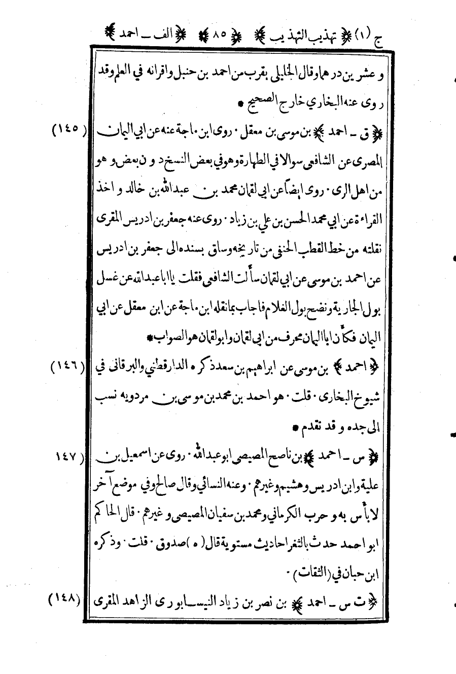 145 _ "ق- أحمد" بن موسى بن معقل. روى بن ماجة عنه عن أبي اليمان المصري عن الشافعي سؤالا في "الطهارة" وهو في بعض النسخ دون بعض, وهو من أهل الري. روى أيضا عن أبي لقمان محمد بن عبد الله بن خالد, وأخذ القراءة عن أبي محمد الحسن بن علي بن زياد, روى عنه جعفر بن إدريس المقري, نقلته من خط القطب الحنفي من "تاريخه", وساق بسنده إلى جعفر بن إدريس عن أحمد بن موسى عن أبي لقمان سألت الشافعي فقلت يا أبا عبد الله عن غسل بول الجارية ونضح بول الغلام, فأجاب بما نقله بن ماجة عن بن معقل عن أبي اليمان, فكأن أبا اليمان محرف من أبي لقمان, وأبو لقمان هو الصواب.