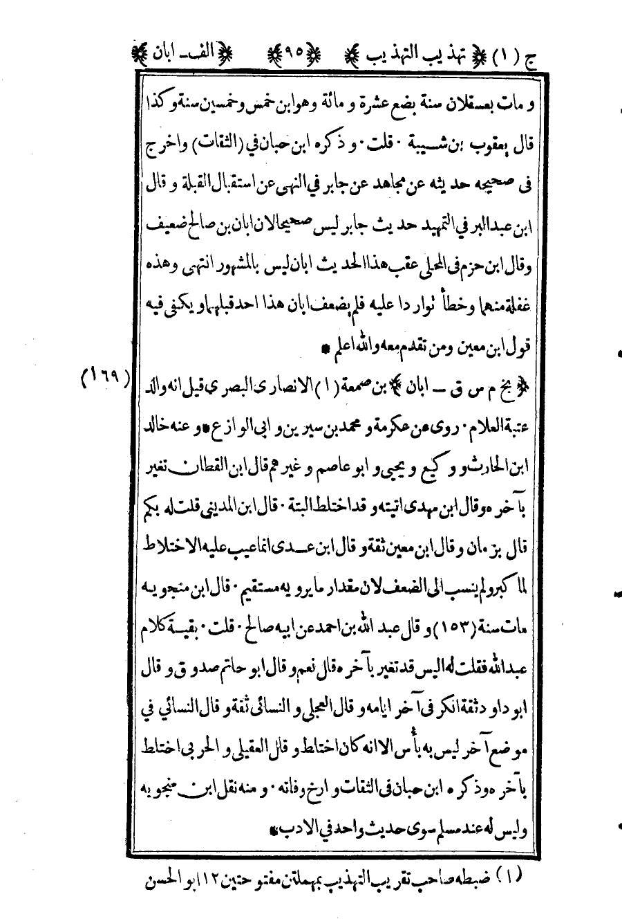 169 _ "بخ م س ق- أبان" بن صمعة1 الأنصاري البصري, قيل إنه والد عتبة العلام. روى عن عكرمة ومحمد بن سيرين وأبي الوازع, وعنه خالد ابن الحارث ووكيع ويحيى وأبو عاصم وغيرهم. قال ابن القطان: "تغير بآخره", وقال ابن مهدي: "أتيته وقد اختلط البتة", قال بن المديني: "قلت له بكم قال بزمان", وقال بن معين: "ثقة", وقال بن عدي: "إنما عيب عليه الاختلاط لما كبر ولم ينسب إلى الضعف؛ لأن مقدار ما يرويه مستقيم". قال بن منجويه: "مات سنة 153, وقال عبد الله بن أحمد عن أبيه: "صالح". قلت: بقية كلام عبد الله فقلت له: أليس قد تغير بآخره؟! قال: نعم", وقال أبو حاتم: "صدوق", وقال أبو داود: "ثقة أنكر في آخر أيامه", وقال العجلي والنسائي: "ثقة", وقال النسائي في موضع آخر: "ليس به بأس إلا أنه كان اختلط", وقال العقيلي والحربي: "اختلط بآخره", وذكره بن حبان في "الثقات" وأرخ وفاته, ومنه نقل بن منجويه وليس له عند مسلم سوى حديث واحد في "الأدب".