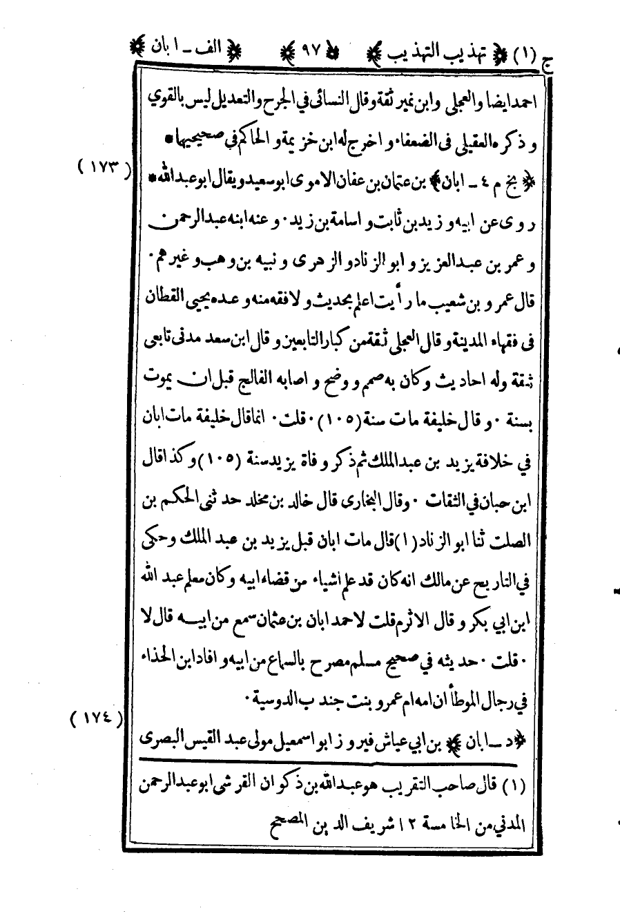173 ـ "بخ م4- أبان" بن عثمان بن عفان الأموي أبو سعيد ويقال أبو عبد الله. روى عن أبيه وزيد بن ثابت وأسامة بن زيد, وعنه ابنه عبد الرحمن وعمر بن عبد العزيز وأبو الزناد والزهري ونبيه بن وهب وغيرهم. قال عمرو بن شعيب: "ما رأيت أعلم بحديث ولا فقه منه", وعده يحيى القطان في فقهاء المدينة, وقال العجلي: "ثقة من كبار التابعين", وقال ابن سعد: "مدني تابعي ثقة وله أحاديث, وكان به صمم ووضح وأصابه الفالج قبل أن يموت بسنة", وقال خليفة: "مات سنة 105". قلت: إنما قال خليفة مات أبان في خلافة يزيد بن عبد الملك ثم ذكر وفاته يزيد سنة 105, وكذا قال بن حبان في "الثقات". وقال البخاري: "قال خالد بن مخلد حدثني الحكم بن الصلت ثنا أبو الزناد1: قال مات أبان قبل يزيد بن عبد الملك, وحكى في "التاريخ" عن مالك أنه كان قد علم أشياء من قضاء أبيه, وكان معلم عبد الله بن أبي بكر, وقال الأثرم: "قلت لأحمد أبان بن عثمان سمع من أبيه قال: لا". قلت: حديثه في "صحيح مسلم" مصرح بالسماع من أبيه, وأفاد بن الحذاء في "رجال الموطأ" أن أمه أم عمرو بنت جندب الدوسية.