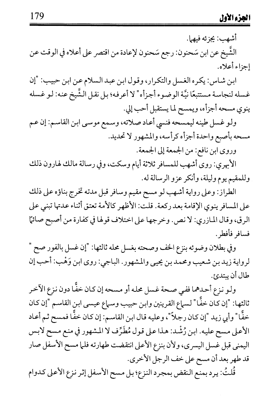 وفي بطلان وضوئه بنزع الخف وصحته بغسل محله ثالثها: "إن غسل بالفور صح" لرواية زيد بن شعيب ومحمد بن يحيى والمشهور. الباجي: روى ابن وهب: أحب إن طال أن يبتدئ.