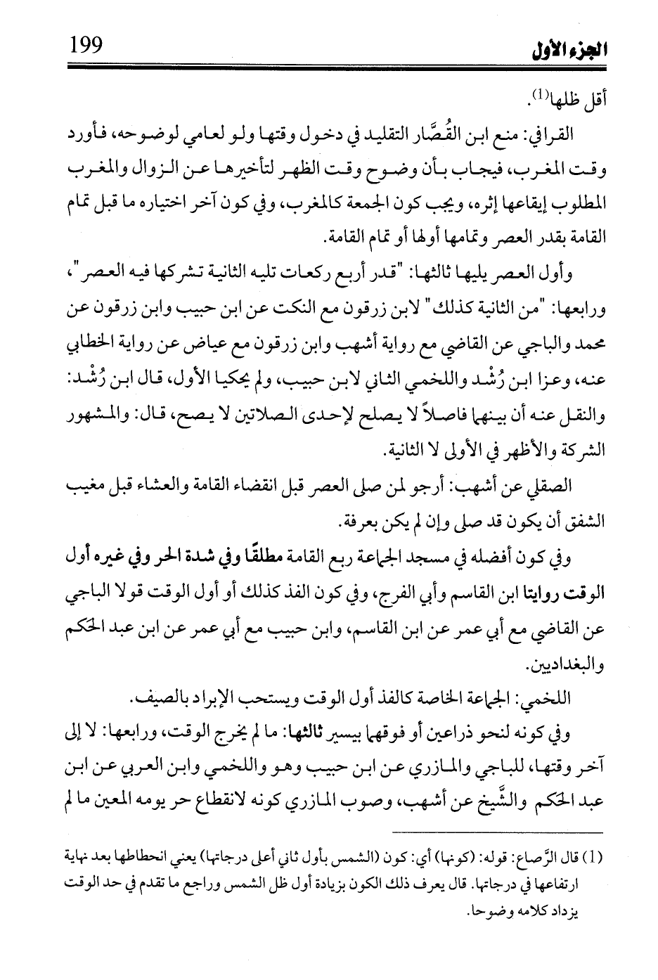وفي كون أفضله في مسجد الجماعة ربع القامة مطلقًا وفي شدة الحر وفي غيره أول الوقت روايتا ابن القاسم وأبي الفرج، وفي كون الفذ كذلك أو أول الوقت قولا الباجي عن القاضي مع أبي عمر عن ابن القاسم، وابن حبيب مع أبي عمر عن ابن عبد الحكم والبغداديين.