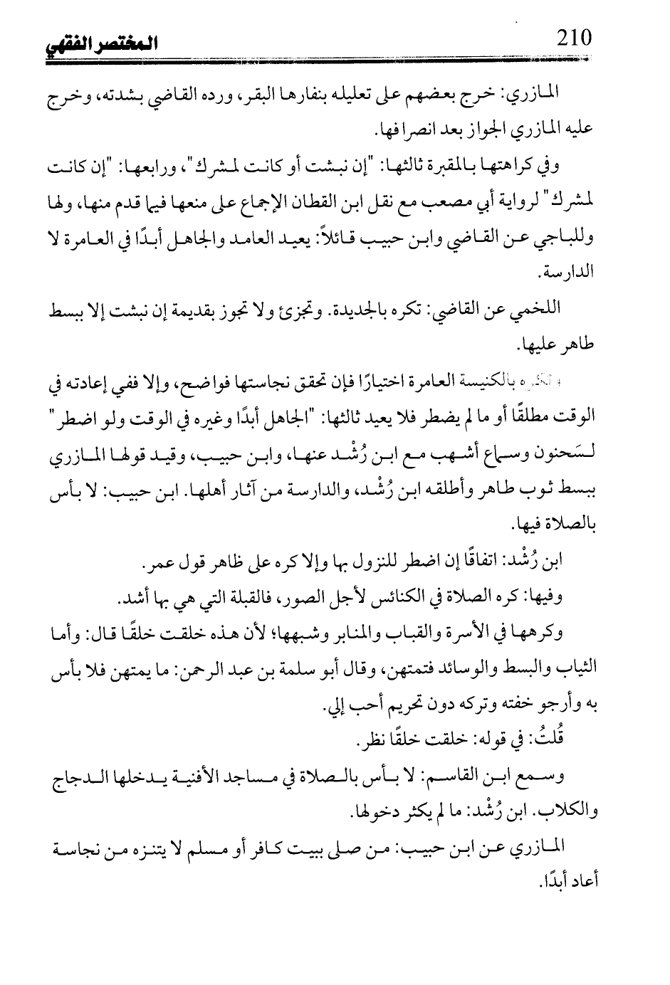 وفي كراهتها بالمقبرة ثالثها: "إن نبشت أو كانت لمشرك"، ورابعها: "إن كانت لمشرك" لراوية أبي مصعب مع نقل ابن القطان الإجماع على منعها فيما قدم منها، ولها وللباجي عن القاضي وابن القاضي وابن حبيب قائلاً: يعيد العامد والجاهل أبدًا في العامرة لا الدراسة.