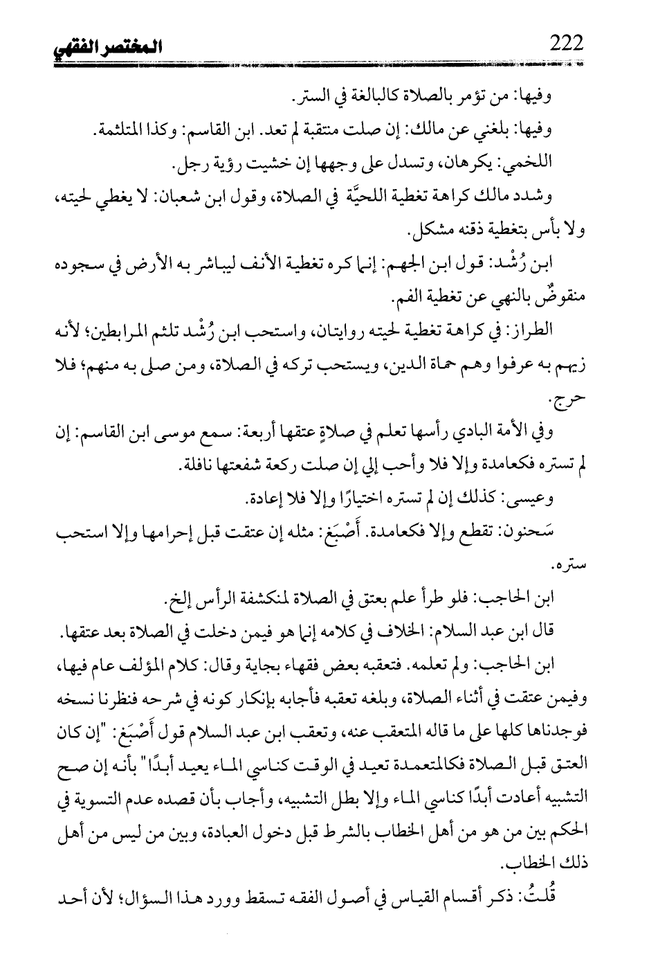 ابن الحاجب: ولم تعلمه. فتعقبه بعض فقهاء بجاية وقال: كلام المؤلف عام فيها، وفيمن عتقت في أثناء الصلاة، وبلغه تعقبه فأجابه بإنكار كونه في شرحه فنظرنا نسخه فوجدناها كلها على ما قاله المتعقب عنه، وتعقب ابن عبد السلام قول أصبغ: "إن كان العتق قبل الصلاة فكالمعتمدة تعيد في الوقت كناسي الماء يعيد أبدًا" بأنه إن صح التشبيه أعادت أبدًا كناسي الماء وإلا بطل التشبيه، وأجاب بأن قصده عدم التسوية في الحكم بين من هو من أهل الخطاب بالشرط قبل دخول العبادة، وبين من ليس من أهل ذلك الخطاب.