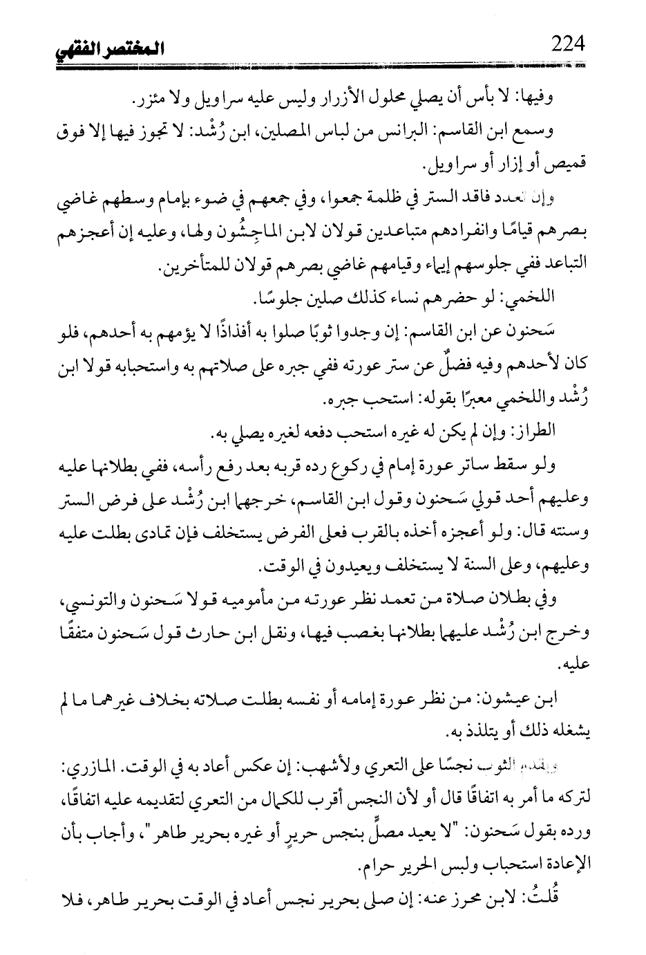 وسمع ابن القاسم: البرانس من لباس المصلين، ابن رُشد: لا تجوز فيه إلا فوق قميص أو إزار أو سراويل.
