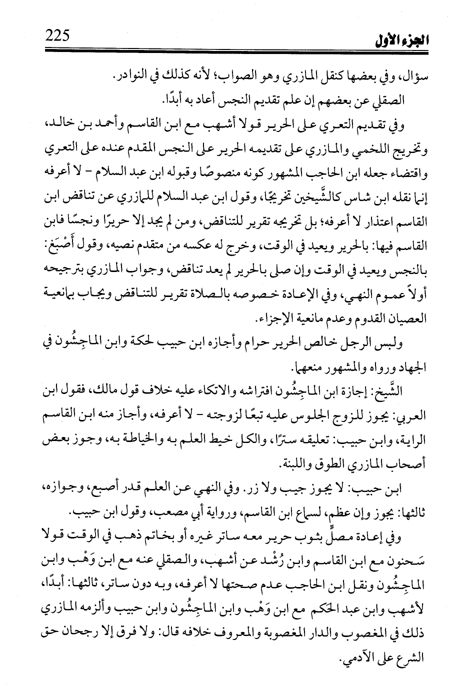 وفي تقديم التعري على الحرير قولا أشهب مع ابن القاسم وأحمد بن خالد، وتخريج اللخمي والمازري على تقديمه الحرير على النجس المقدم عنده على التعري واقتضاء جعله ابن الحاجب المشهور كونه منصوصًا وقبوله ابن عبد السلام - لا أعرفه إنما نقله ابن شاس كالشيخين تخريجًا، وقول ابن عبد السلام للمازري عن تناقض ابن القاسم اعتذار لا أعرفه؛ بل تخريجه تقرير للتناقض، ومن لم يجد إلا حريرًا ونجسًا فابن القاسم فيها: بالحرير ويعيد في الوقت، وخرج له عكسه من متقدم نصيه، وقول أصبغ: بالنجس ويعيد في الوقت وإن صلى بالحرير لم يعد تناقض، وجوب المازري بترجيحه أولاً عموم النهي، وفي الإعادة خصوصه بالصلاة تقرير للتناقض ويجاب بمانعية العصيان القدوم وعدم مانعية الإجزاء.