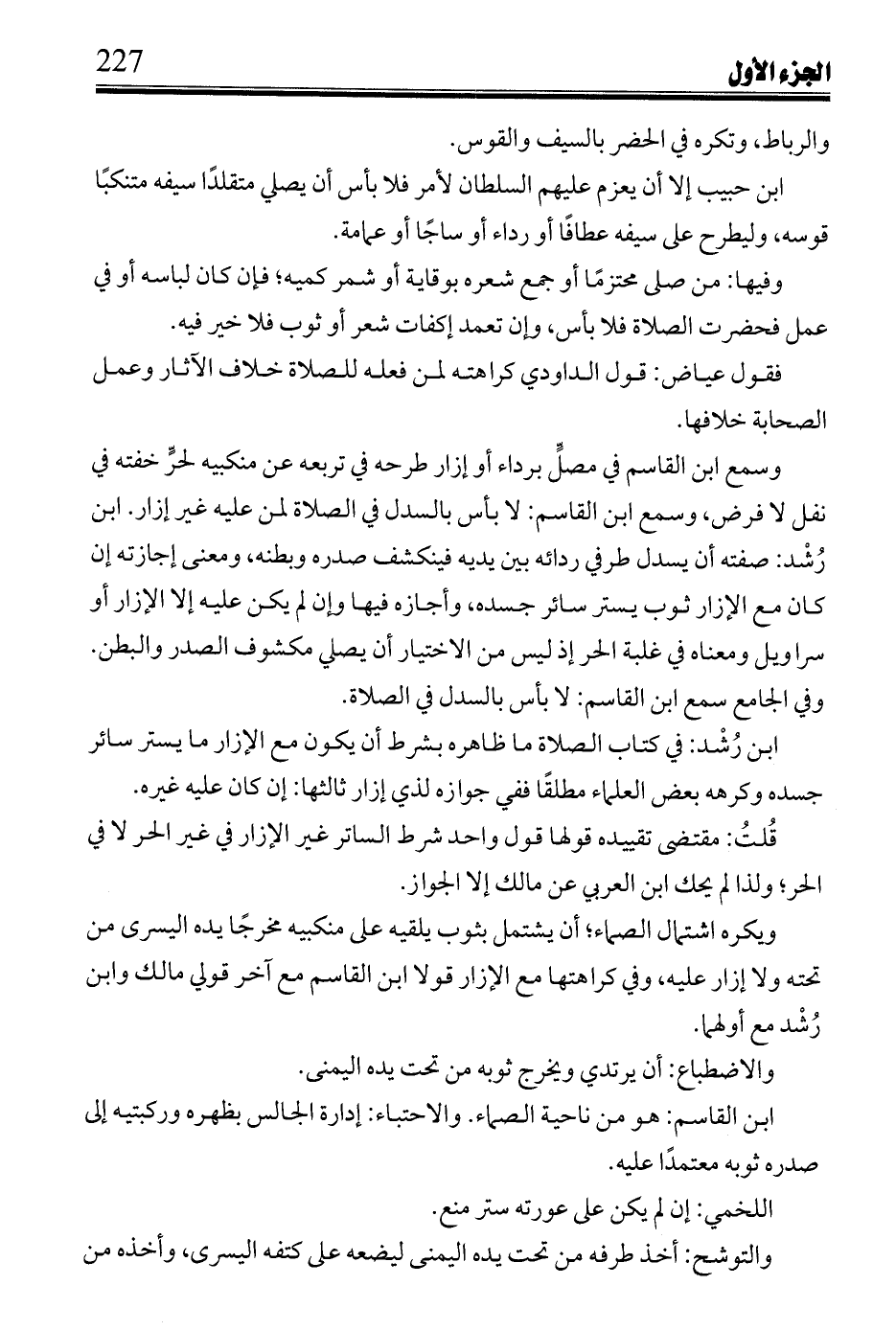 ابن رُشد: في كتاب الصلاة ما ظاهره بشرط أن يكون مع الإزار ما يستر سائر جسده وكرهه بعض العلماء مطلقًا ففي جوازه لذي إزار ثالثها: إن كان عليه غيره.