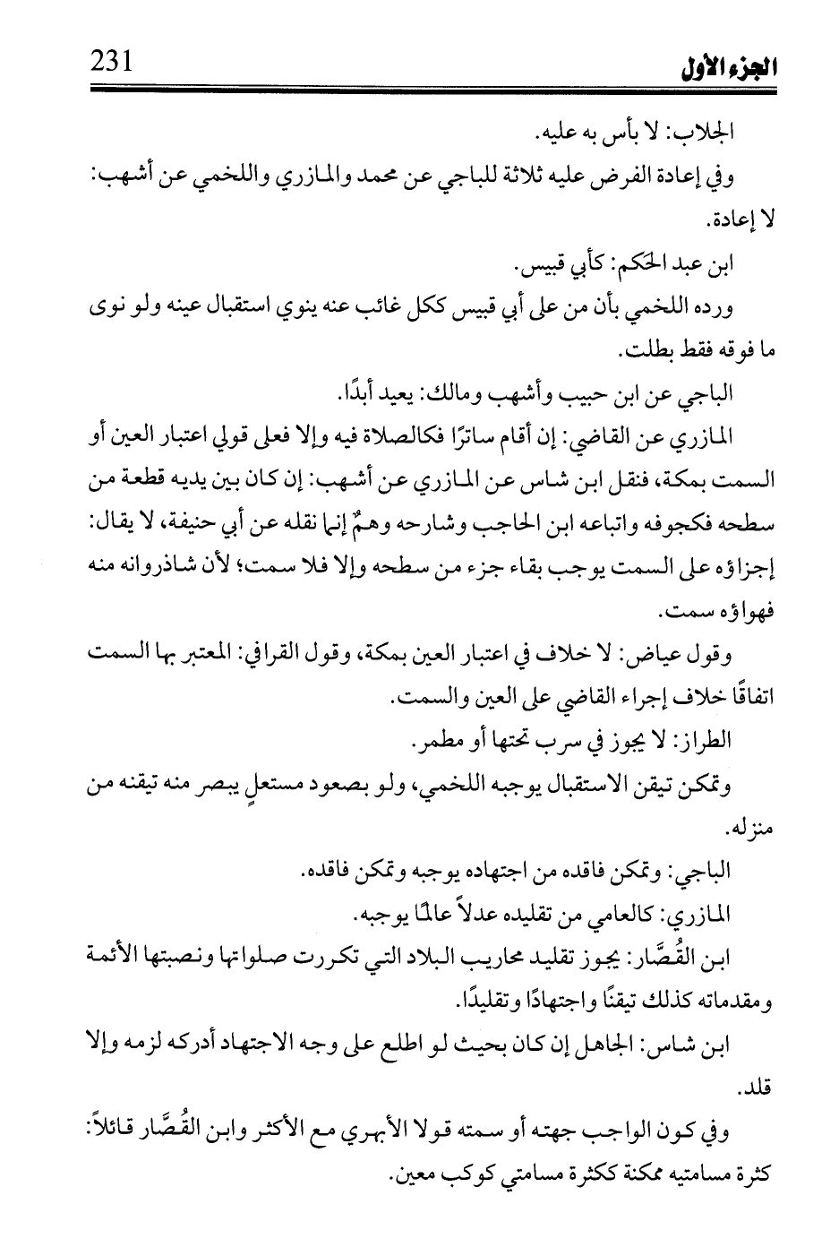 وفي كون الواجب جهته أو سمت قولا الأبهري مع الأكثر وابن القُصَّار قائلاً: كثرة مسامتيه ممكنة ككثرة مسامتي كوكب معين.