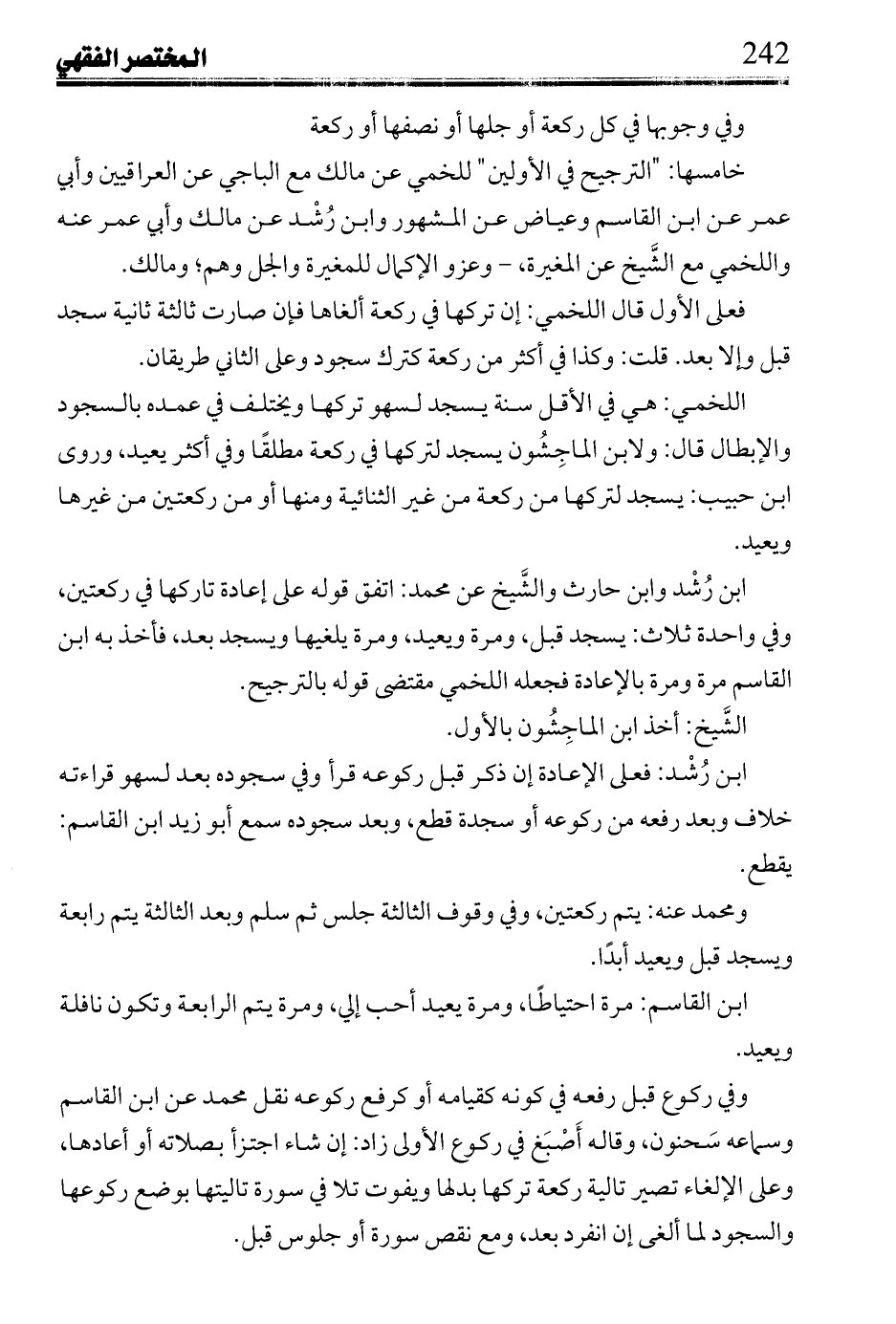 ابن رُشد وابن حارث والشيخ عن محمد: اتفق قوله على إعادة تاركها في ركعتين، وفي واحدة ثلاث: يسجد قبل، ومرة ويعيد، ومرة يلغيها ويسجد بعد، فأخذ به ابن القاسم مرة ومرة بالإعادة فجعله اللخمي مقتضى قوله بالترجيح.