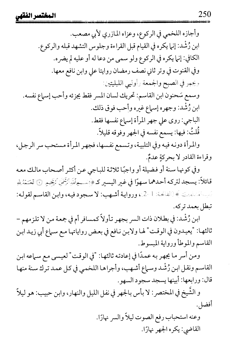 ابن رُشد: في بطلان ذات السر بجهر تأولاً كمسافر أم في جمعة من لا تلزمهم - ثالثها: "يعيدون في الوقت" لها ولابن نافع في بعض رواياتها مع سماع أبي زيد ابن القاسم والموطأ ورواية المبسوط.