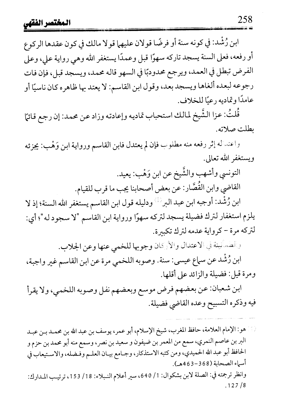 ابن رُشد: أوجبه ابن عبد البر ودليله قول ابن القاسم يستغفر الله السنة؛ إذ لا يلزم استغفار لترك فضيلة يسجد لتركه سهوًا ورواية ابن القاسم "لا سجود له"؛ أي: لتركه مرة - كرواية عدمه لترك تكبيرة.