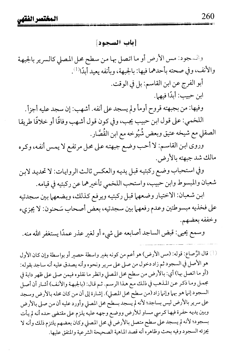 والسجود: مس الأرض أو ما اتصل بها من سطح محل المصلي كالسرير بالجبهة والأنف، وفي صحته بأحدهما فيها: بالجبهة، وبأنفه يعيد أبدًا.