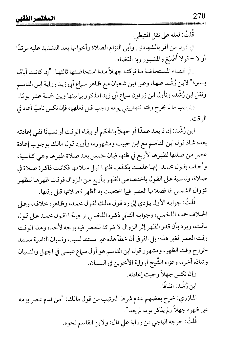وترتيب ما لم يخرج وقته كنهاريتي يومه واجب قبل فعلهما، فإن نكس ناسيًا أعاد في الوقت. ابن رُشد: إن لم يعد عمدًا أو جهلاً بالحكم أو ببقاء الوقت أو نسيانًا ففي إعادته بعده شاذ قول ابن القاسم مع ابن حبيب ومشهوره، وأورد قول مالك بوجوب إعادة عصر من صلتها لظهرها لأربع في ظنها فبان لخمس بعد صلاة ظهرها وهي كناسية، وأجاب بقول محمد: إنها علمت بكذب ظنها قبل سلامها فكانت ذاكرة صلاة في صلاة، وناسية على القول باختصاص الظهر بأربع من الزوال فوقت ظهرها للظهر كزوال الشمس لها فصلاتها العصر فيما اختصت به الظهر كصلاتها قبل وقتها.