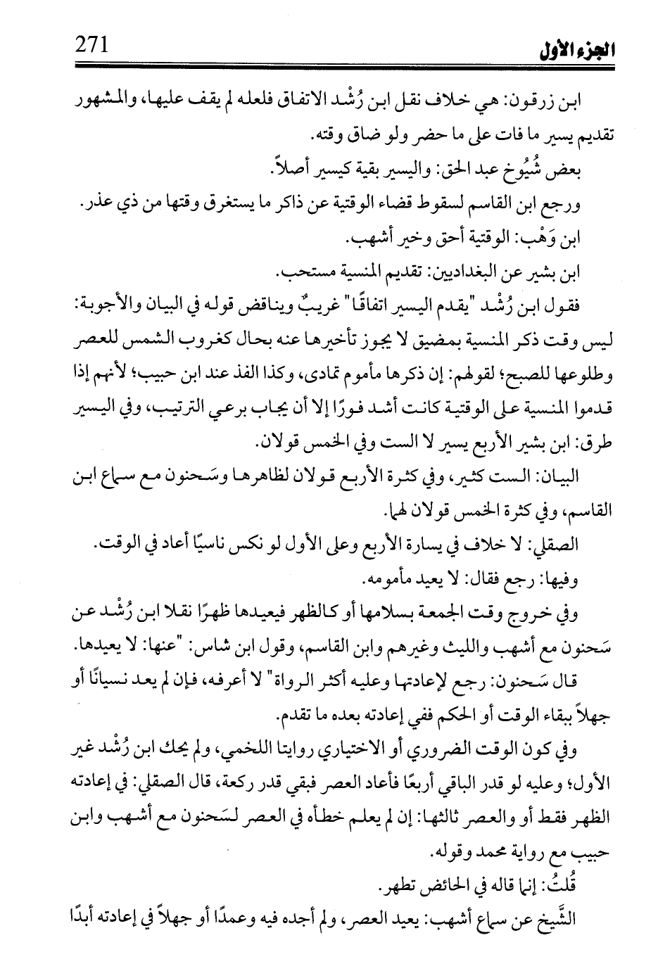 ابن زرقون: هي خلاف نقل ابن رُشد الاتفاق فلعله لم يقف عليها، والمشهور تقديم يسير ما فات على ما حضر ولو ضاق وقته.