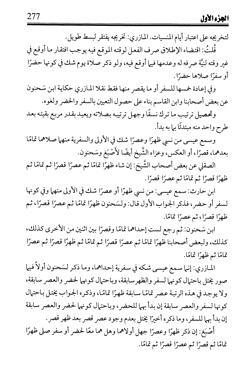 المازري: إنما سمع عيسى شكه في سفرية إحداهما، وما ذكر لسحنون أولاً فيما صور يختل باحتمال كونهما لسفر والظهر سابقة، وباحتمال كونهما لحضر والعصر سابقة، ولا يوجد في هذه الرتبة عصر تمامًا سابقة ظهرًا تمامًا، وذكره الجواب يختل باحتمال كونها لسفر والعصر سابقة إن بدأ بهما للحضر، وباحتمال كونها لحضر والعصر سابقة إن بدأ بهما للسفر، وما ذكره أخيرًا يختل بعدم وجود عصر قصر بعد ظهر قصر.
