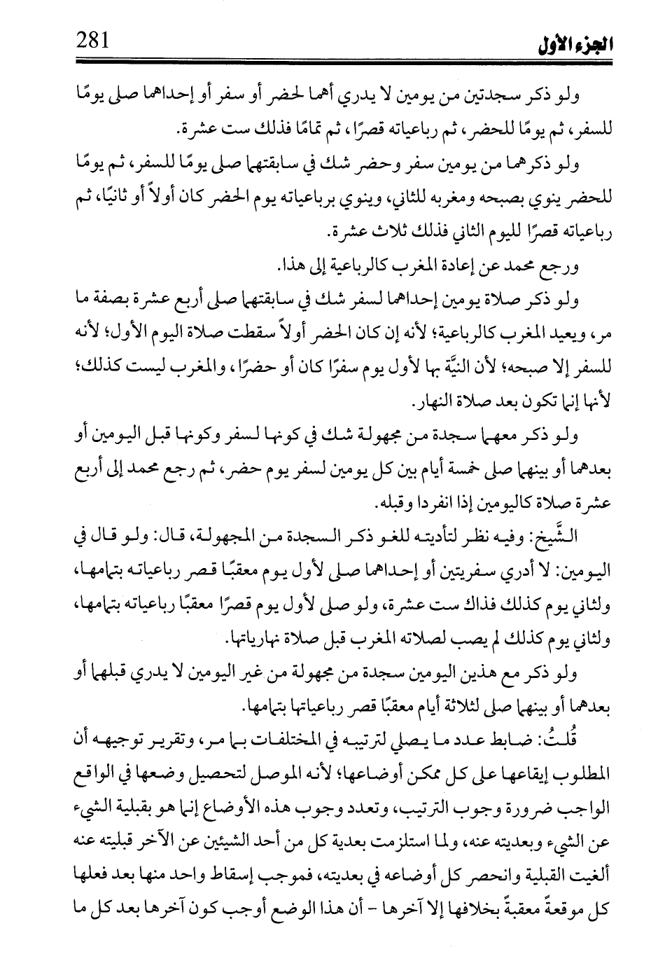 الشيخ: وفيه نظر لتأديته للغو ذكر السجدة من المجهولة، قال: ولو قال في اليومين: لا أدري سفريتين أو إحداهما صلى لأول يوم معقبًا قصر رباعياته بتمامها، ولثاني يوم كذلك فذاك ست عشرة، ولو صلى لأول يوم قصرًا معقبًا رباعياته بتمامها، ولثاني يوم كذلك لم يصب لصلاته المغرب قبل صلاة نهارياتها.