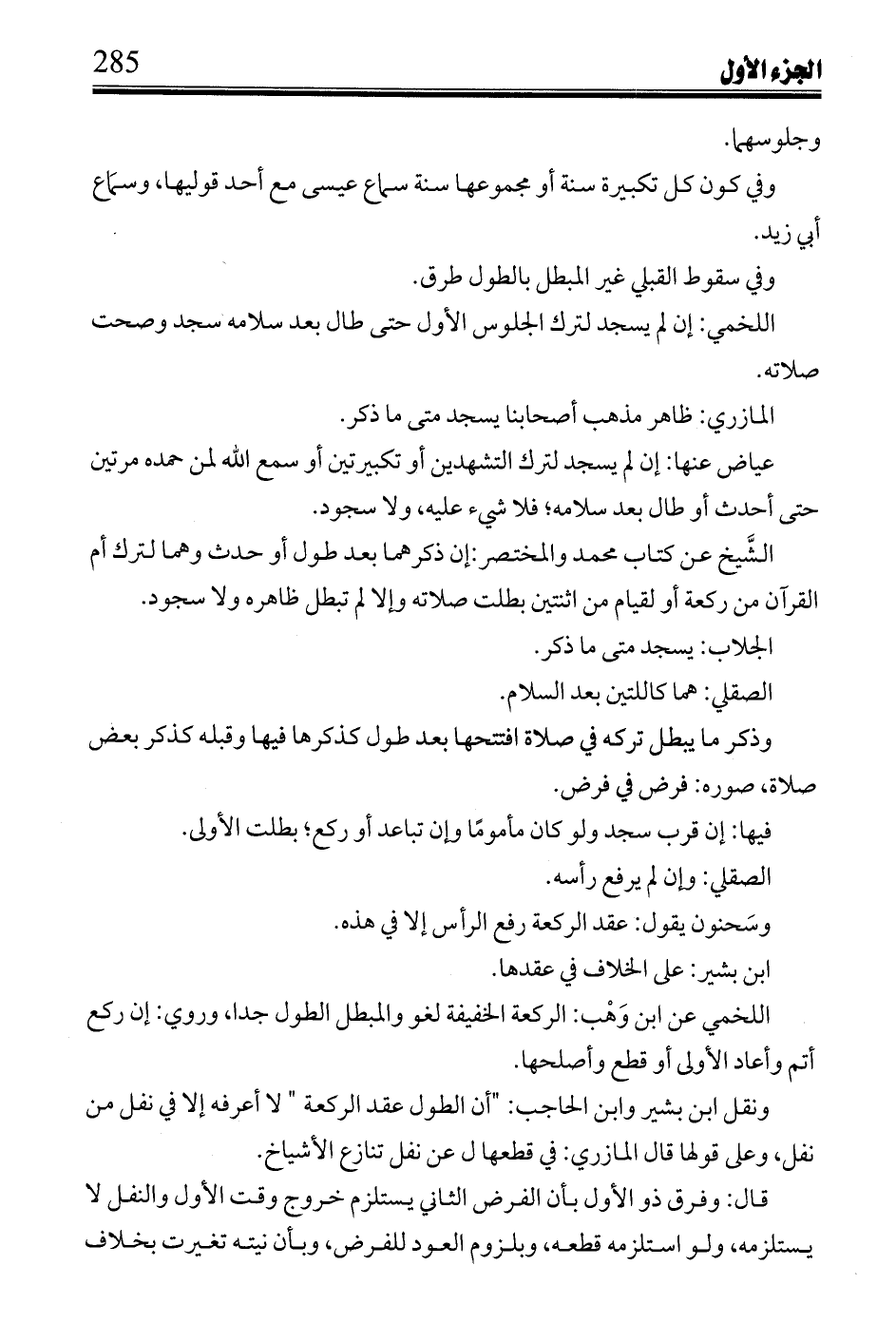 اللخمي: إن لم يسجد لترك الجلوس الأول حتى طال بعد سلامه سجد وصحت صلاته.
