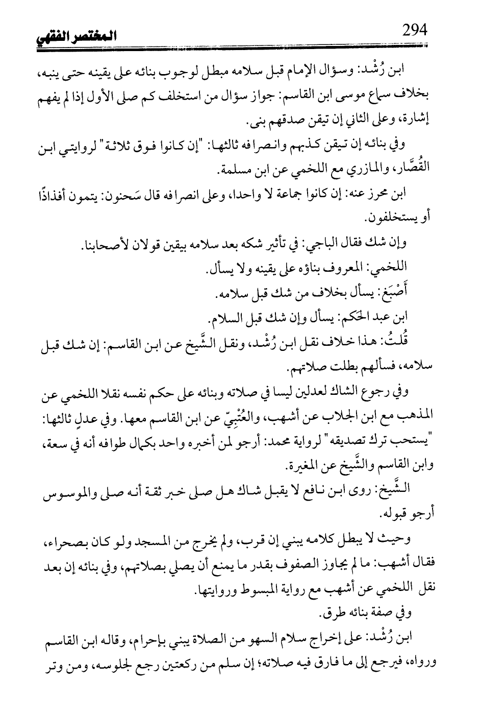 ابن رُشد: على إخراج سلام السهو من الصلاة يبني بإحرام، وقاله ابن القاسم ورواه، فيرجع إلى ما فارق فيه صلاته؛ إن سلم من ركعتين رجع لجلوسه، ومن وتر