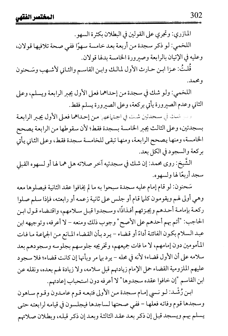 ابن رُشد: لو نسي إمام سجدة من الأولى فتبعه قوم عامدون وقوم ساهون وسجدها قوم وفاته فعلها - ففي صحتها لساجدها فيجلسون في قيامه لرابعته حتى يسلم بهم ويسجد قبل إن ذكر بعد عقد الثالثة وبعد إن ذكر قبله، وبطلان صلاتهم