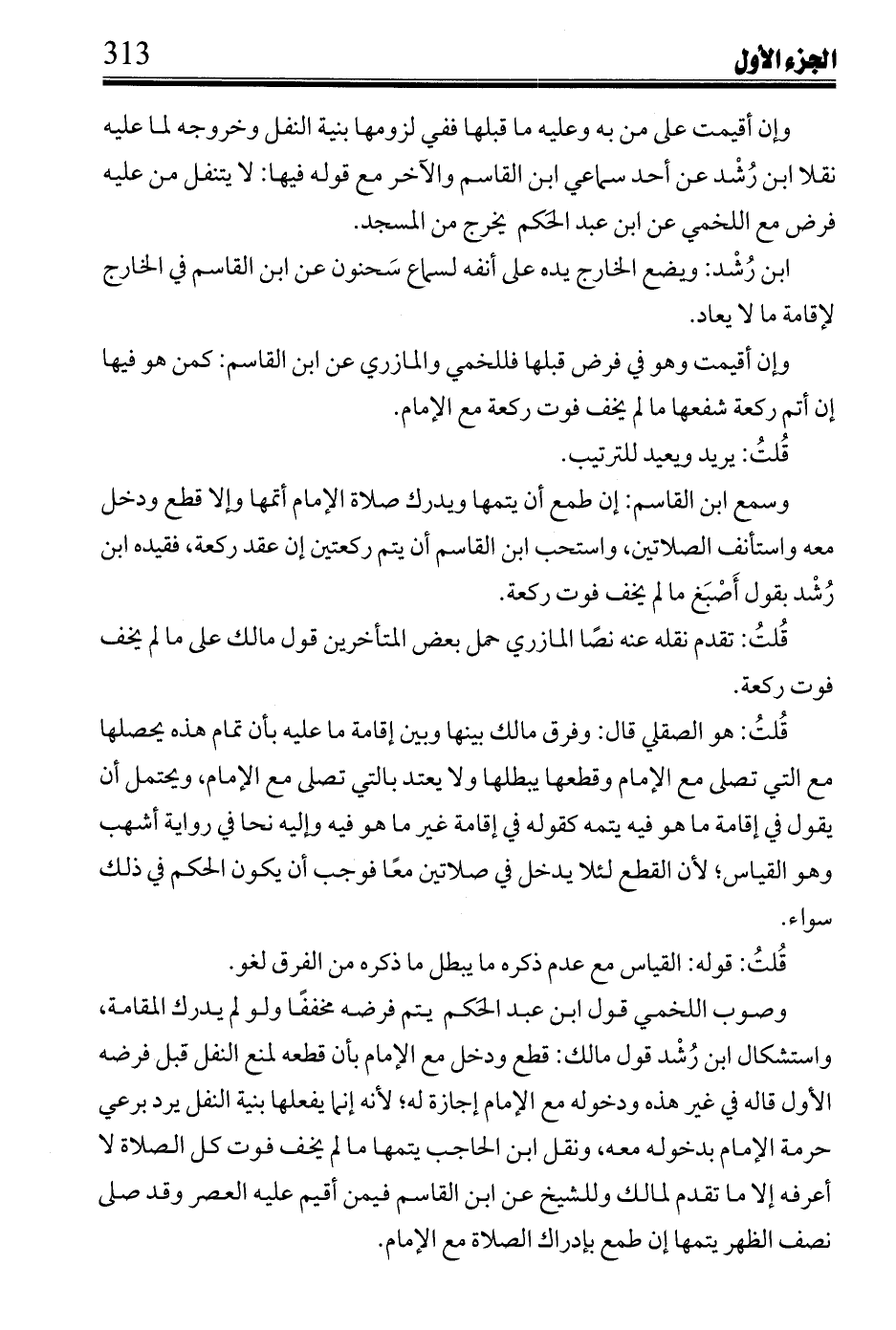 وصوب اللخمي قول ابن عبد الحكم يتم فرضه مخففًا ولو لم يدرك المقامة، واستشكال ابن رُشد قول مالك: قطع ودخل مع الإمام بأن قطعه لمنع النفل قبل فرضه الأول قاله في غير هذه ودخوله مع الإمام إجازة له؛ لأنه إنما يفعلها بنية النفل يرد برعي حرمة الإمام بدخوله معه، ونقل ابن الحاجب يتمها ما لم يخف فوت كل الصلاة لا أعرفه إلا ما تقدم لمالك، وللشيخ عن ابن القاسم فيمن أقيم عليه العصر وقد صلى نصف الظهر يتمها إن طمع بإدراك الصلاة مع الإمام.