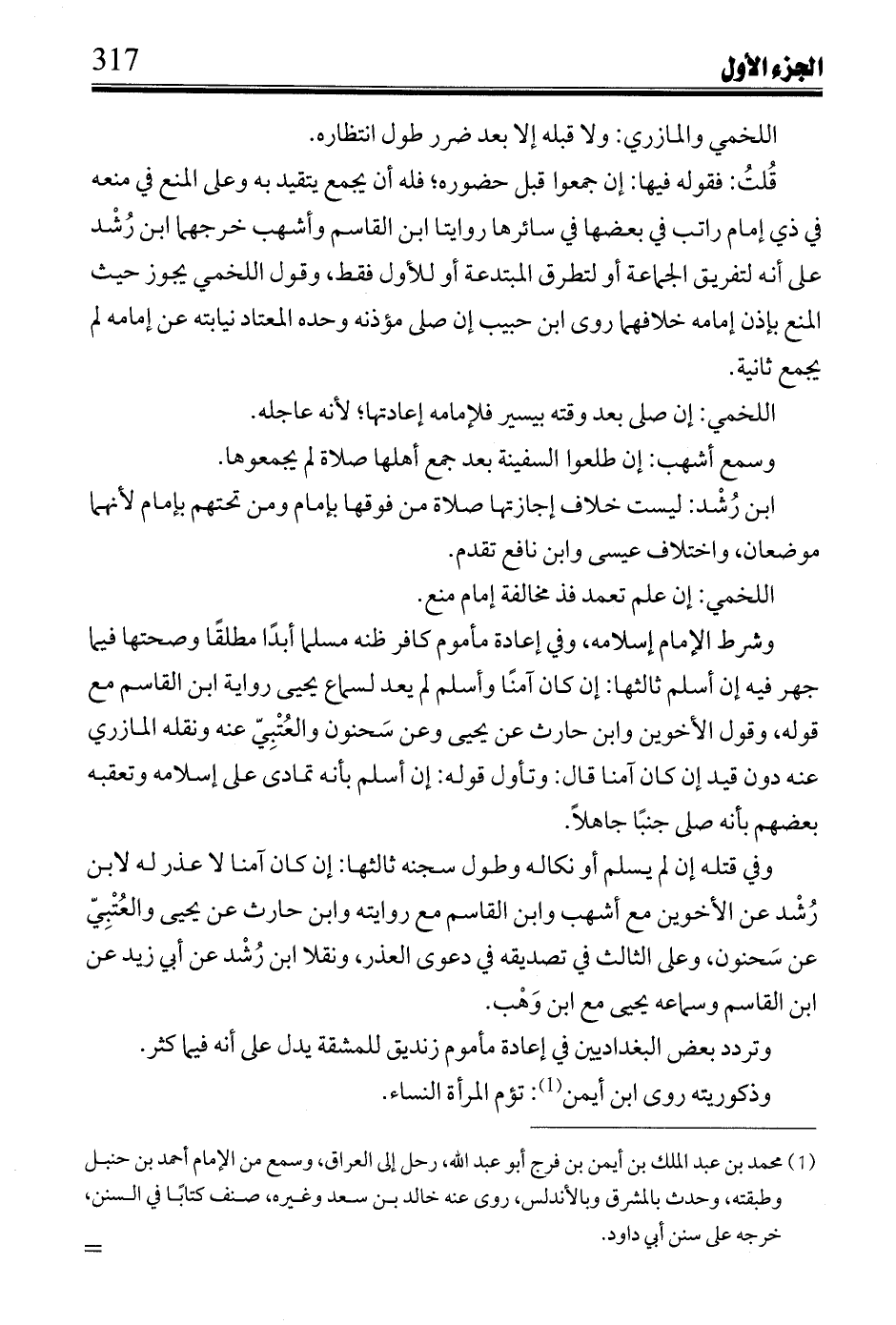 وشرط الإمام إسلامه، وفي إعادة مأموم كافر ظنه مسلما أبدًا مطلقًا وصحتها فيها جهر فيه إن أسلم ثالثها: إن كان آمنًا وأسلم لم يعد لسماع يحيى رواية ابن القاسم مع قوله، وقول الأخوين وابن حارث عن يحيى وعن سحنون والعُتبي عنه ونقله المازري عنه دون قيد إن كان آمنا قال: وتأول قوله: إن أسلم بأنه تمادى على إسلامه وتعقبه بعضهم بأنه جنبًا جاهلاً.