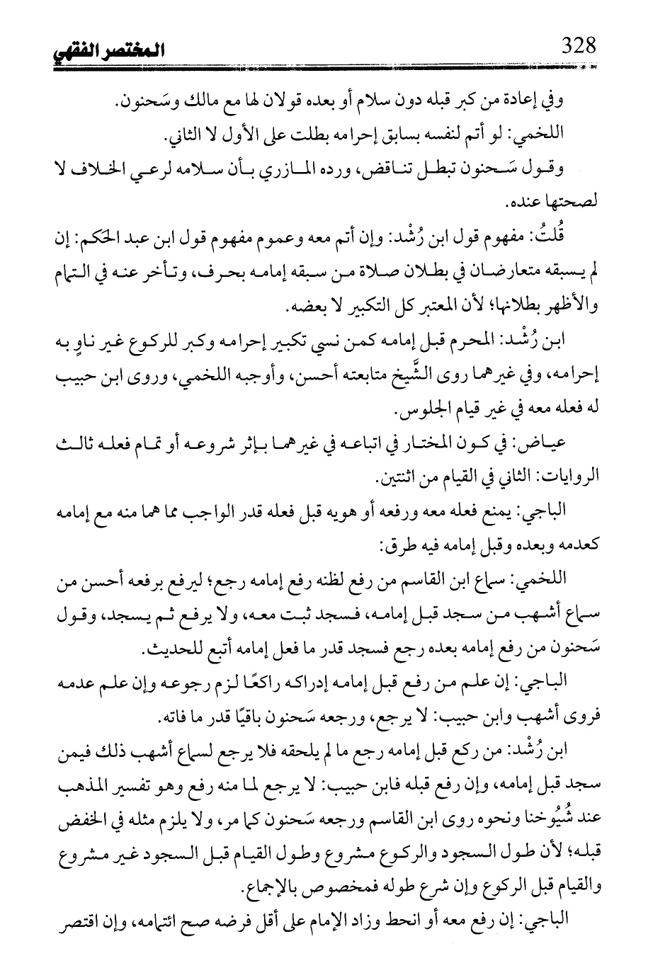 ابن رُشد: المحرم قبل إمامه كمن نسي تكبير إحرامه وكبر للركوع غير ناو به إحرامه، وفي غيرهما روى الشيخ متابعته أحسن، وأوجبه اللخمي، وروى ابن حبيب له فعله معه في غير قيام الجلوس.