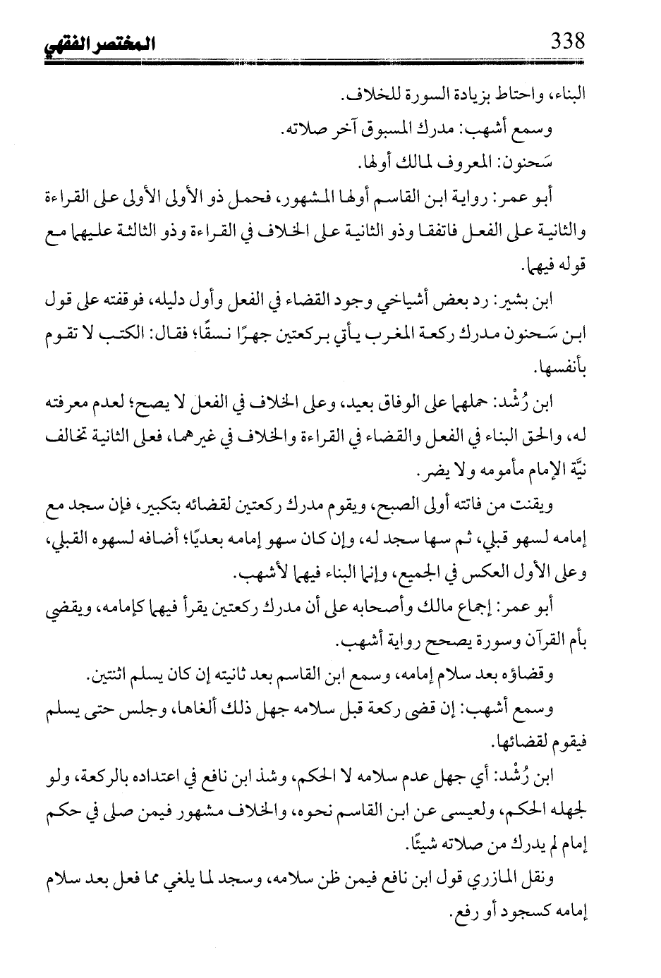 ابن بشير: رد بعض أشياخي وجود القضاء في الفعل وأول دليله، فوقفته على قول ابن سحنون مدرك ركعة المغرب يأتي بركعتين جهرًا نسقًا؛ فقال: الكتب لا تقوم بأنفسها.
