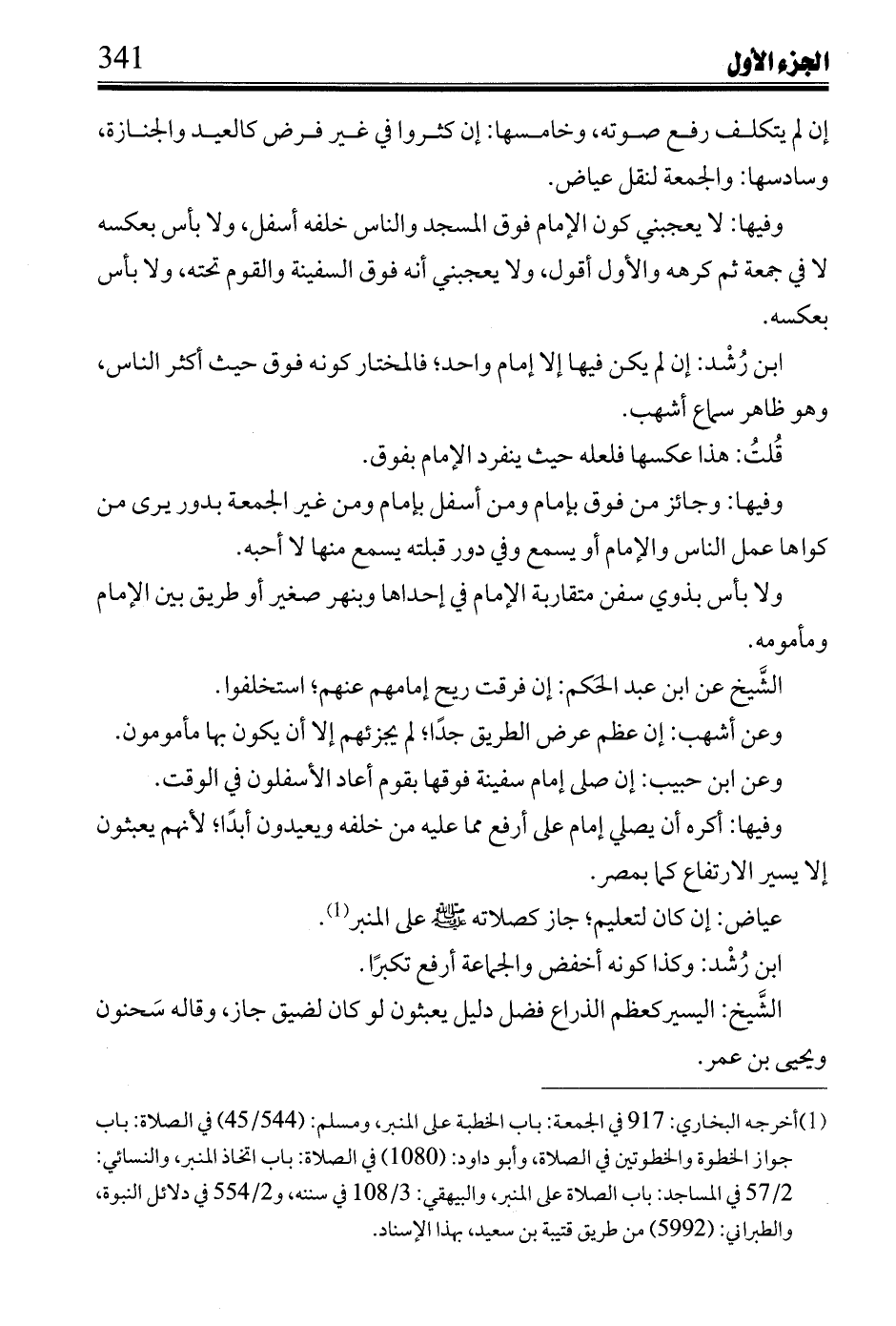 وفيها: لا يعجبني كون الإمام فوق المسجد والناس خلفه أسفل، ولا بأس بعكسه لا في جمعة ثم كرهه والأول أقول، ولا يعجبني أنه فوق السفينة والقوم تحته، ولا بأس بعكسه.