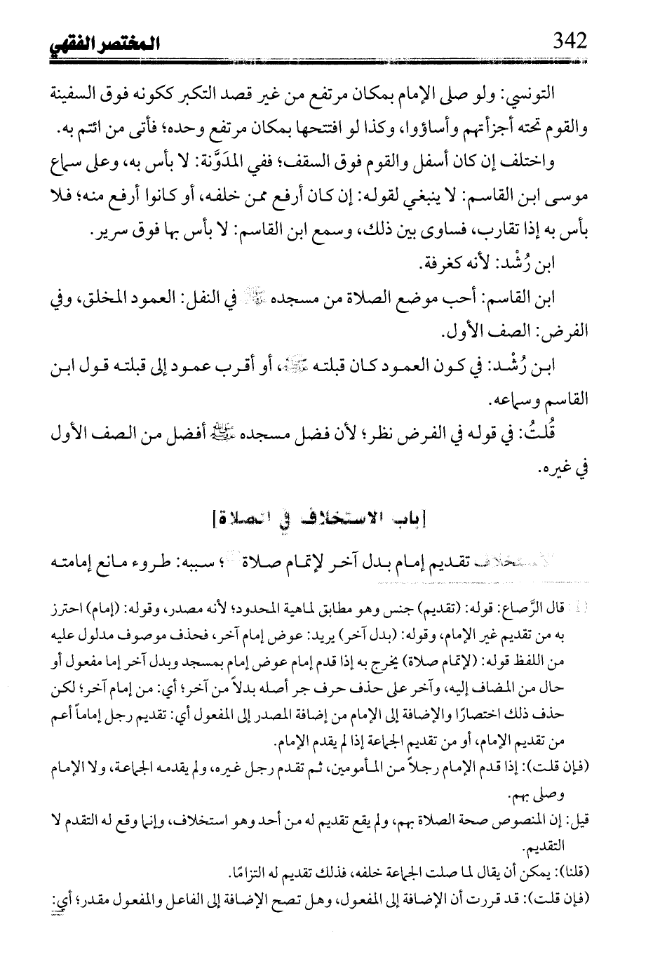 التونسي: ولو صلى الإمام بمكان مرتفع من غير قصد التكبر ككونه فوق السفينة والقوم تحته أجزأتهم وأساؤوا، وكذا لو افتتحها بمكان مرتفع وحده؛ فأتى من ائتم به.