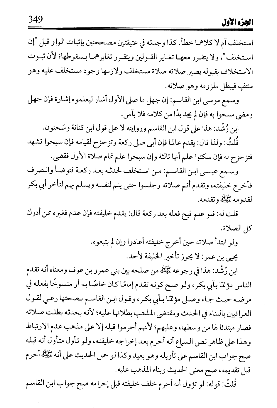 ابن رُشد: هذا في رجوعه صلى الله عليه وسلم من صلحه بين بني عمرو بن عوف ومعناه أنه تقد الناس مؤتمًا بأبي بكر، ولو صح كونه تقدم إمامًا كان خاصًا به أو منسوخًا بفعله في مرضه حيث جاء وصلى مؤتمًا بأبي بكر، وقول أبن القاسم بصحتها رعي لقول العراقيين بالبناء في الحدث ومقتضى المذهب بطلانها عليه؛ لأنه بحدثه بطلت صلاته فصار مبتدئا لها من وسطها، وعليهم؛ لأنهم أحرموا قبله إلا على مذهب عدم الارتباط وهذا على ظاهر نص السماع أنه أحرم بعد إخراجه خليفته، ولو تأول متأول أنه قبله صح جواب ابن القاسم على تأويله وهو بعيد وكذا لو حمل الحديث على أنه صلى الله عليه وصلم أحرم قبل تقديمه، صح معنى الحديث وبناء المذهب عليه.