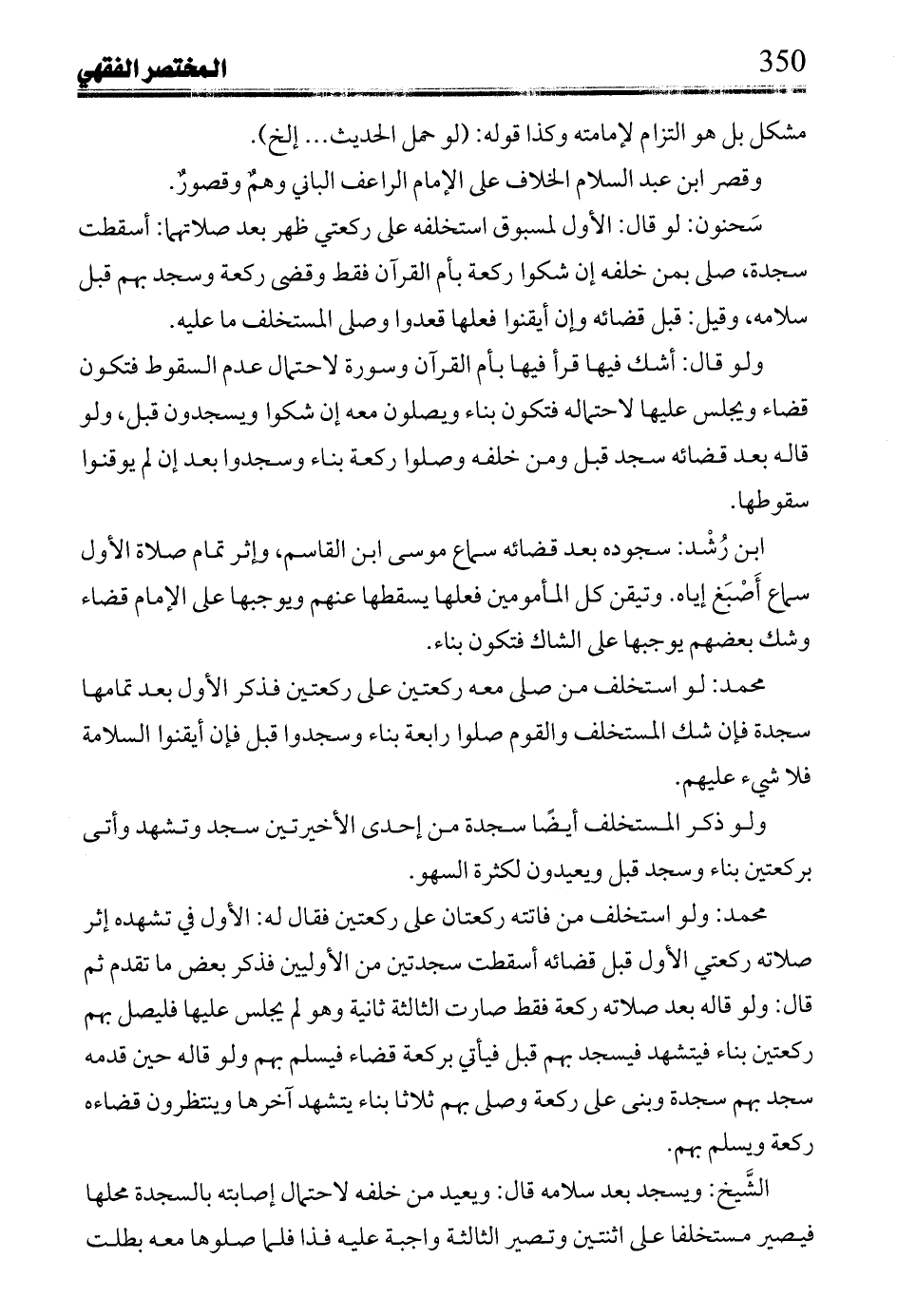 ولو ذكر المستخلف أيضًا سجدة من إحدى الأخيرتين سجد وتشهد وأتى بركعتين بناء وسجد قبل ويعيدون لكثرة السهو.