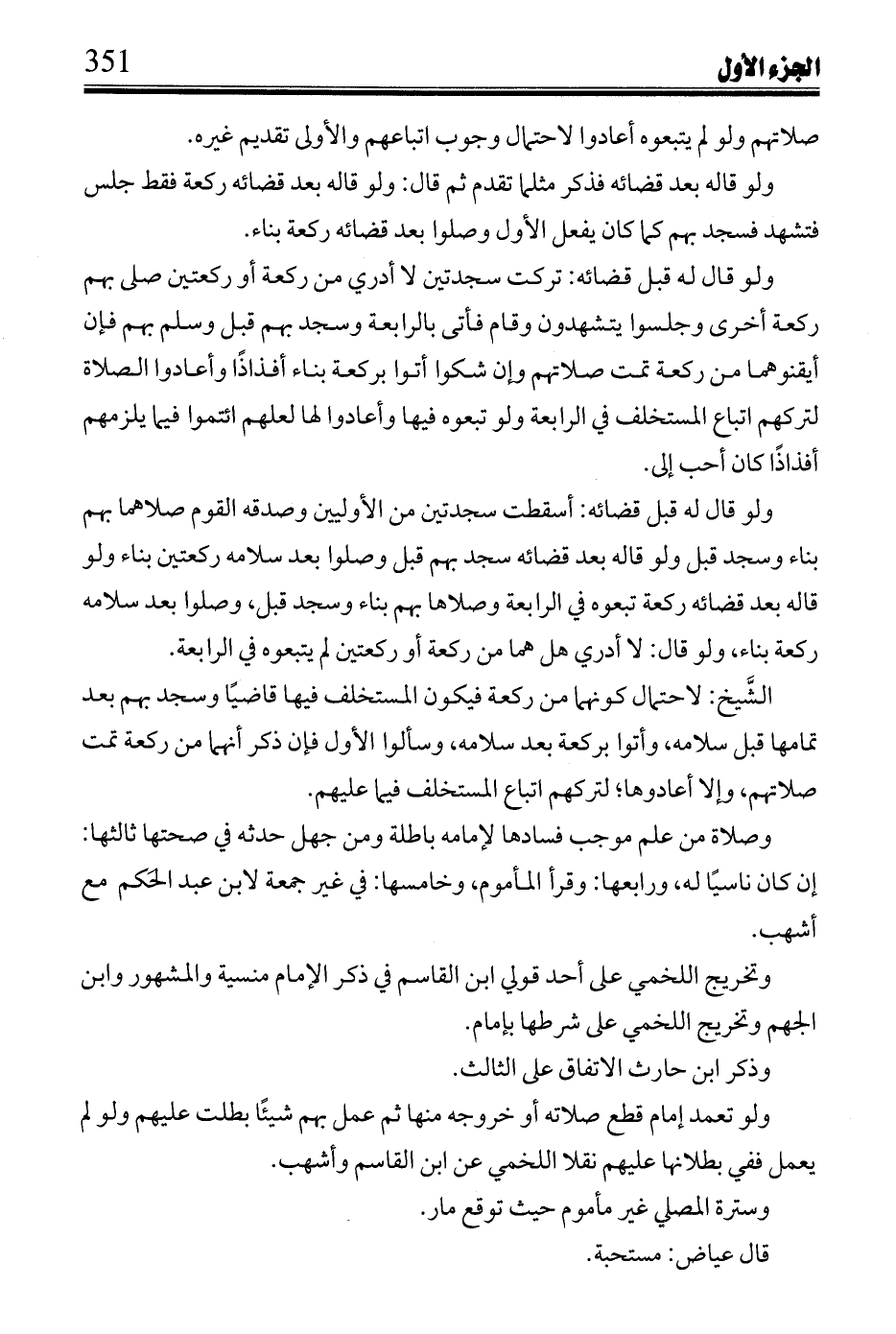 وتخريج اللخمي على أحد قولي ابن القاسم في ذكر الإمام منسية والمشهور وابن الجهم وتخريج اللخمي على شرطها بإمام.