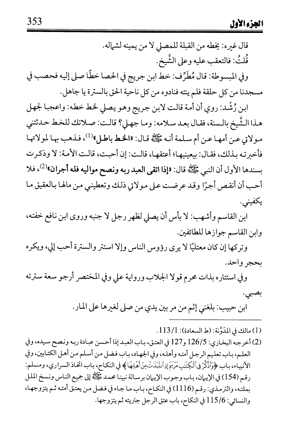 ابن رُشد: روي أن أمة قالت لابن جريج وهو يصلي لخط خطه: واعجبا لجهل هذا الشيخ بالسنة، فقال بعد سلامه: وما جهلي؟ قالت: صلاتك للخط حدثتني مولاتي عن أمها عن أم سلمة أنه صلى الله عليه وسلم قال: "الخط باطل"، فذهب بها لمولاتها فأخبرته بذلك، فقال: بيعينيها؛ أعتقها، قالت: إن أحبت، قالت الأمة: لا وذكرت بسندها الأول أن النبي صلى الله عليه وسلم قال: "إذا اتقى العبد ربه ونصح مواليه فله أجران"، فلا أحب أن أنقض أجرًا وقد عرضت على مولاتي ذلك وتعطيني من مالها بالعقيق ما يكفيني.
