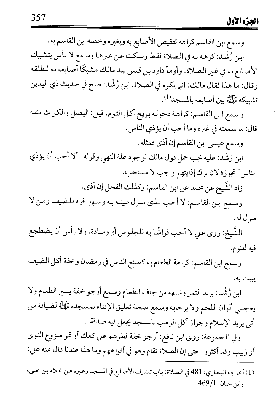 ابن رُشد: يريد التمر وشبهه من جاف الطعام وسمع أرجو خفة يسير الطعام ولا يعجبني ألوان اللحم ولا برحابه وسمع صحة تعليق الإقناء بمسجده صلى الله عليه وسلم لضيافة من أتى يريد الإسلام وجواز أكل الرطب بالمسجد يجعل فيه صدقة.