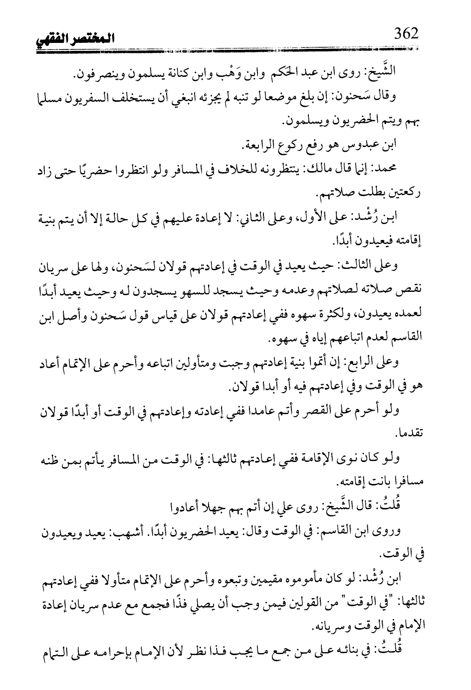 ابن رشد: على الأول, وعلى الثاني: لا إعادة عليهم في كل حالة إلا أن يتم بنية إقامته فيعيدون أبدا.