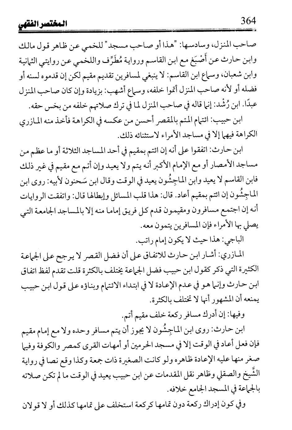 ابن حارث: اتفقوا على انه إن ائتم بمقيم في احد المساجد الثلاثة أو ما عظم من مساجد الأمصار أو مع الإمام الأكبر انه يتم ولا يعيد وان أتم مع مقيم في غير ذلك فابن القاسم لا يعيد وابن الماجشون يعيد في الوقت وقال ابن سحنون لأبيه: روى ابن الماجشون إن ائتم بمقيم أعاد. قال: هذا قلب المسائل وإبطالها قال: واتفقت الروايات انه إن اجتمع مسافرون ومقيمون قدم كل فريق إماما منه إلا بالمساجد الجامعة التي يصلي بها الأمراء فان المسافرين يتمون معه.