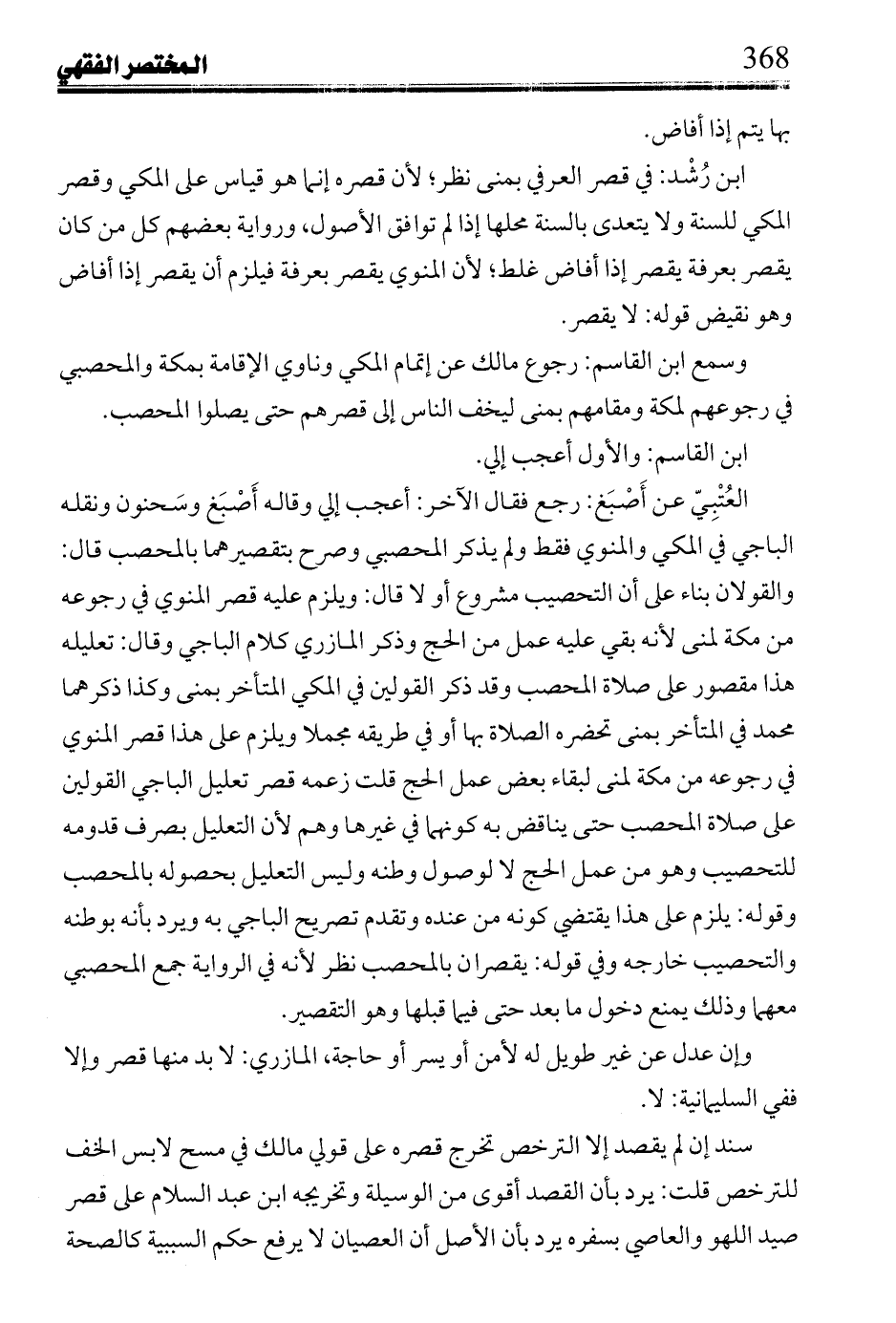 ابن رشد: في قصر العرفي بمنى نظر؛ لان قصره إنما هو قياس على المكي وقصر المكي للسنة ولا يتعدى بالسنة محلها إذا لم توافق الأصول, ورواية بعضهم كل من كان يقصر بعرفة يقصر إذا أفاض غلط؛ لان المنوي يقصر بعرفة فيلزم أن يقصر إذا أفاض وهو نقيض قوله: لا يقصر.