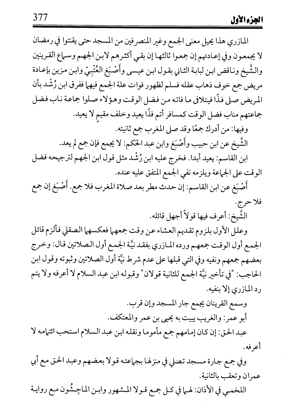 المازري هذا يحيل معنى الجمع وغير المنصرفين من المسجد حتى يقنتوا في رمضان لا يجمعون وفي إعادتهم إن جمعوا ثالثها أن بقي أكثرهم لابن الجهم وسماع القرينين والشيخ وناقض ابن لبابة الثاني بقول ابن عيسى واصبغ العتبي وابن مزين بإعادة مريض جمع خوف ذهاب عقله فسلم لظهور فوات على الجمع فيهما ففرق ابن رشد بأن المريض صلى فذا فيتلافى ما فاته من فضل الوقت وهؤلاء صلوا جماعة ناب فضل جماعتهم مناب فضل الوقت كمسافر أتم فذا يعيد وخلف مقيم لا يعيد.
