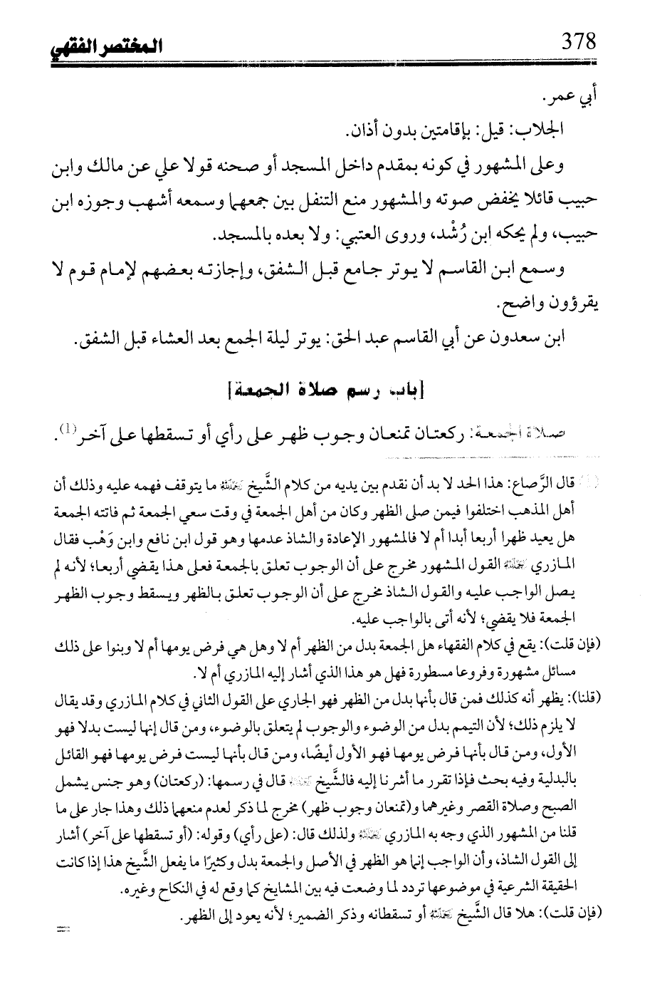 وعلى المشهور في كونه بمقدم داخل المسجد أو صحنه قولا على عن مالك وابن حبيب قائلا يخفض صوته والمشهور منع التنفل بين جمعها وسمعه أشهب وجوزه ابن حبيب, ولم يحكه ابن رشد, وروى العتبي: ولا بعده بالمسجد.