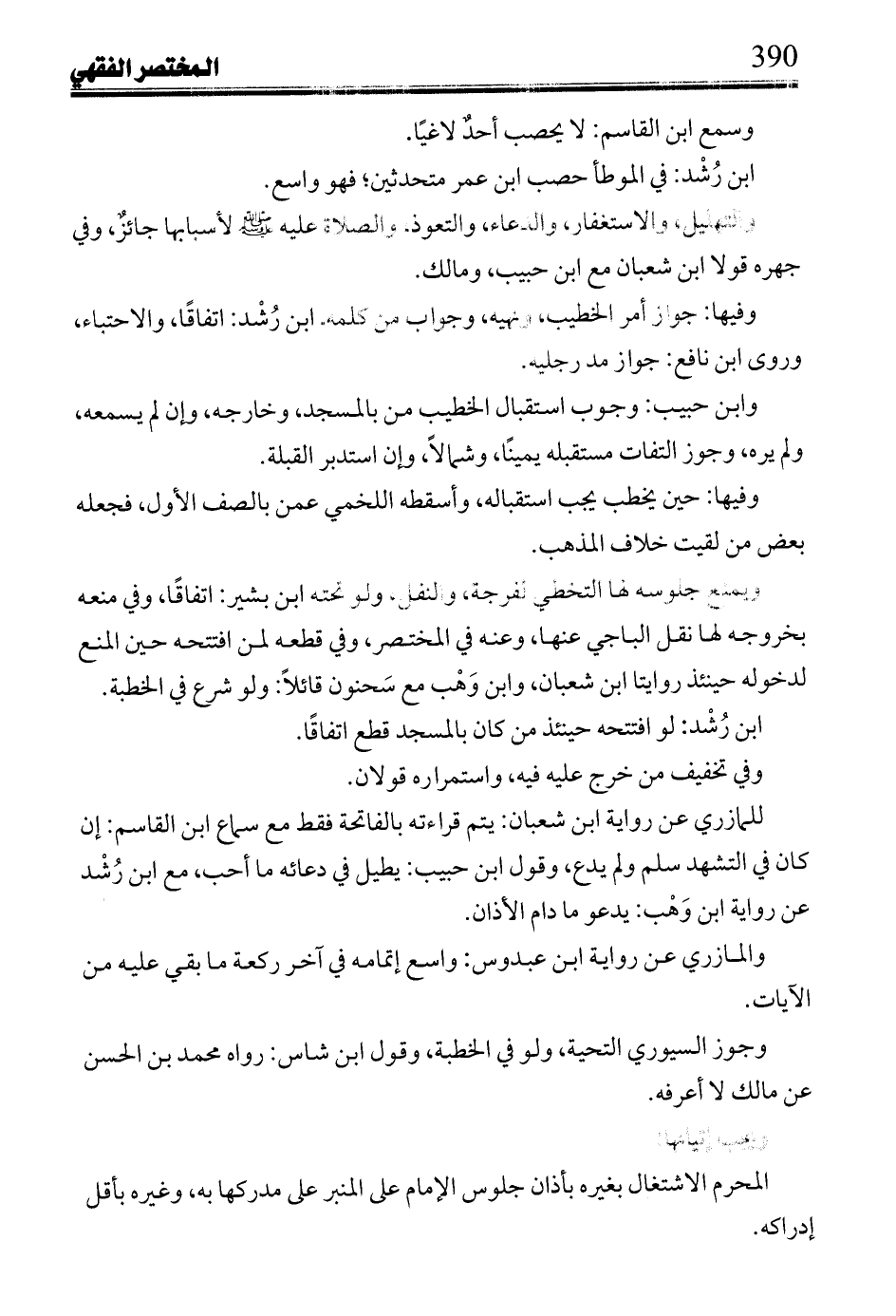 ويمنع جلوسه لها التخطي لفرجة, والنفل, ولو نحته ابن بشير: اتفاقا, وفي منعه بخروجه لها نقل الباجي عنها, وعنه في المختصر, وفي قطعه لمن افتتحه حين المنع لدخوله حينئذ روايتا ابن شعبان, وابن وهب مع سحنون قائلا: ولو شرع في الخطبة.