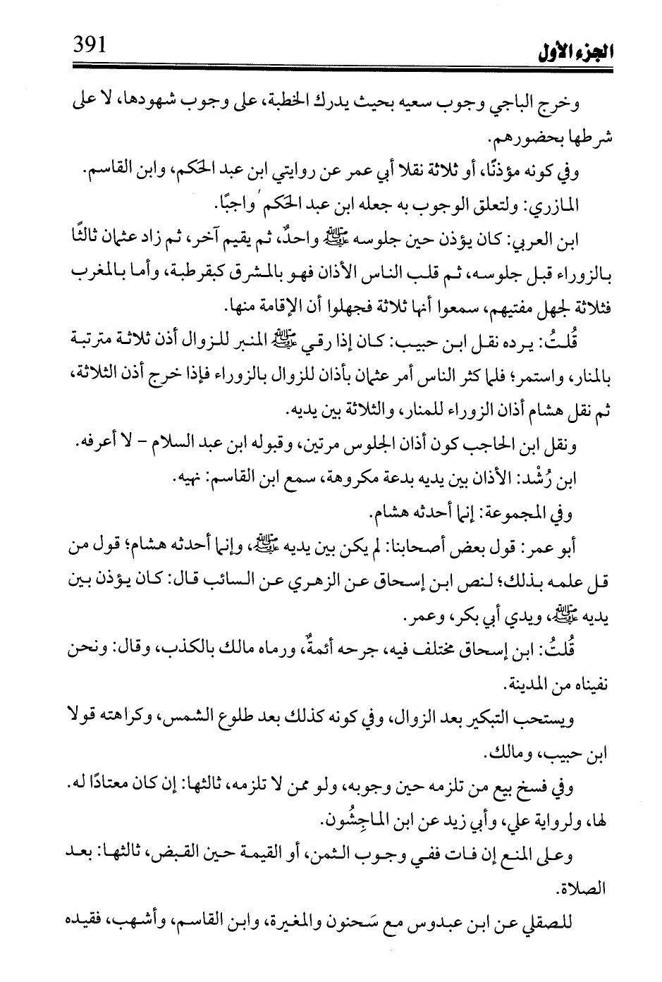 قلت: يرده نقل ابن حبيب: كان إذا رقى صلى الله عليه وسلم المنبر للزوال أذن ثلاثة مترتبة بالمنار, واستمر؛ فلما كثر الناس أمر عثمان بأذان للزوال بالزوراء فإذا خرج أذن الثلاثة, ثم نقل هشام أذان الزوراء للمنار, والثلاثة بين يديه.