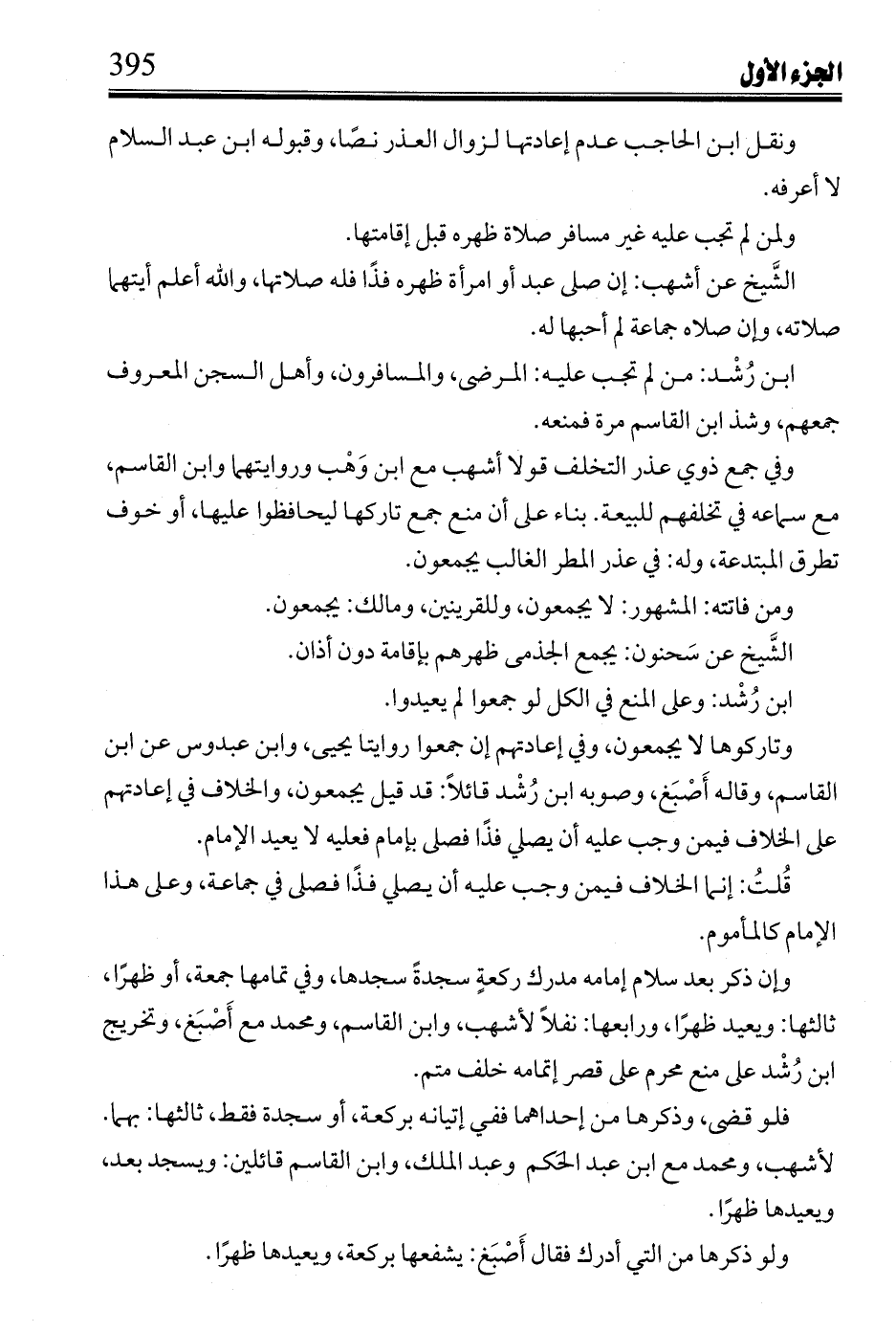 ابن رشد: من لم تجب عليه: المرضى, والمسافرون, وأهل السجن المعروف جمعهم, وشذ ابن القاسم مرة فمنعه.
