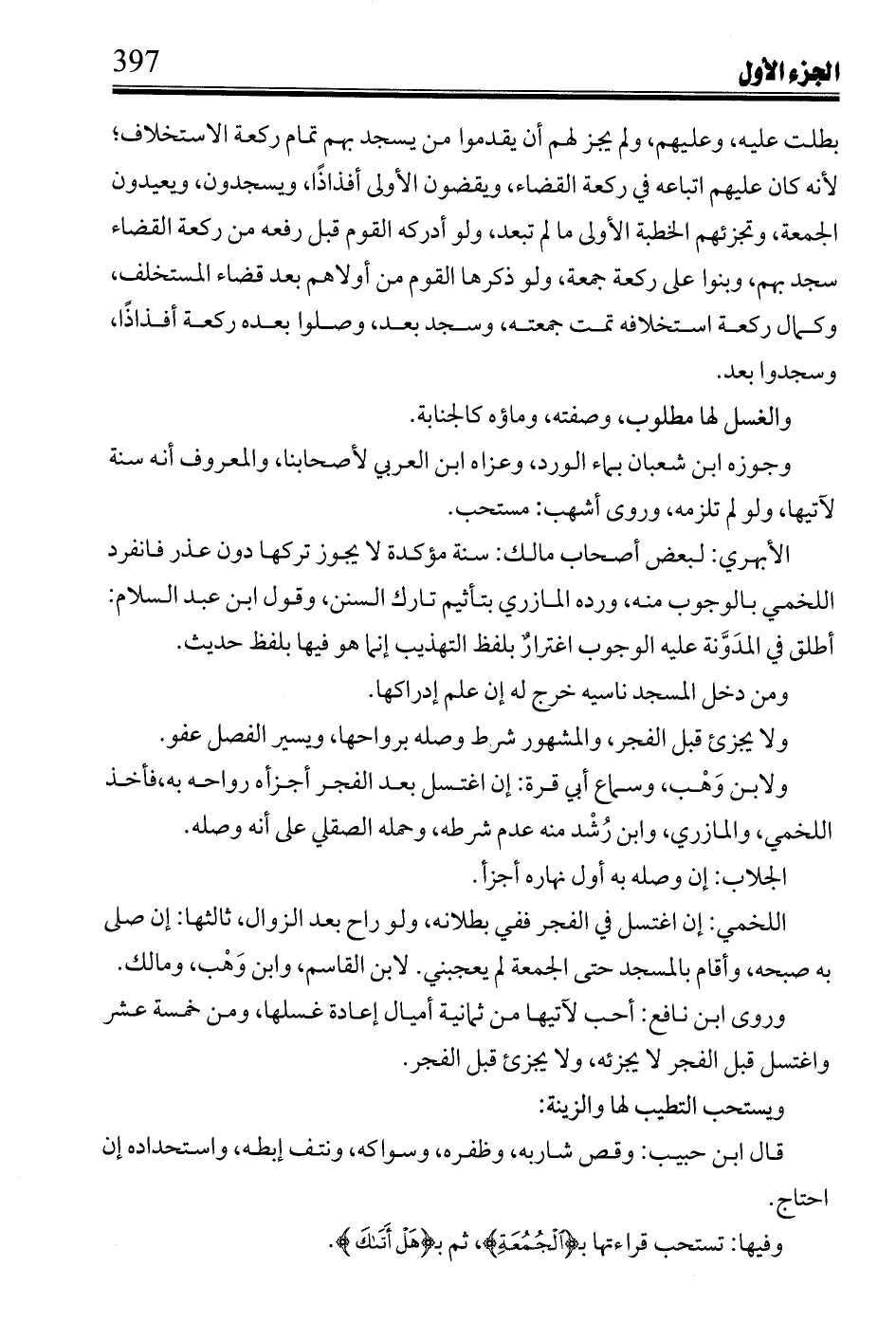 الأبهري: لبعض أصحاب مالك: سنة مؤكدة لا يجوز تركها دون عذر فانفرد اللخمي بالوجوب منه, ورده المازري بتأثيم تارك السنن, وقول ابن عبد السلام: أطلق في المدونة عليه الوجوب اغترار بلفظ التهذيب إنما هو فيها بلفظ حديث.