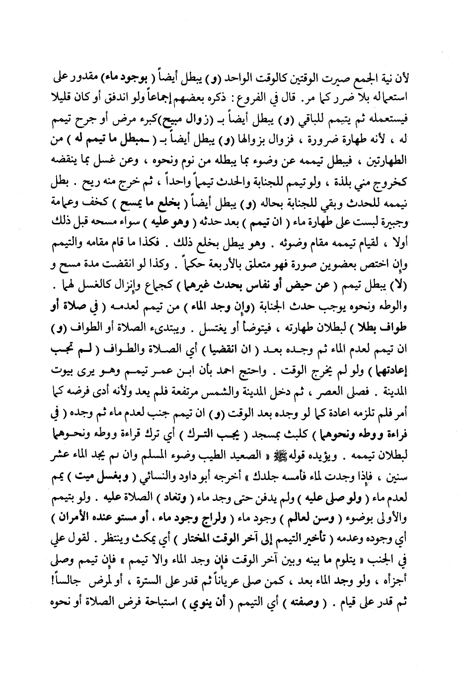 لِأَنَّ نِيَّةَ الْجَمْعِ صَيَّرَتْ الْوَقْتَيْنِ كَالْوَقْتِ الْوَاحِدِ (وَ) يَبْطُلُ أَيْضًا (بِوُجُودِ مَاءٍ) مَقْدُورٍ عَلَى اسْتِعْمَالِهِ بِلَا ضَرَرٍ كَمَا مَرَّ قَالَ فِي الْفُرُوعِ: ذَكَرَهُ بَعْضُهُمْ إجْمَاعًا وَلَوْ انْدَفَقَ أَوْ كَانَ قَلِيلًا فَيَسْتَعْمِلُهُ ثُمَّ يَتَيَمَّمُ لِلْبَاقِي.