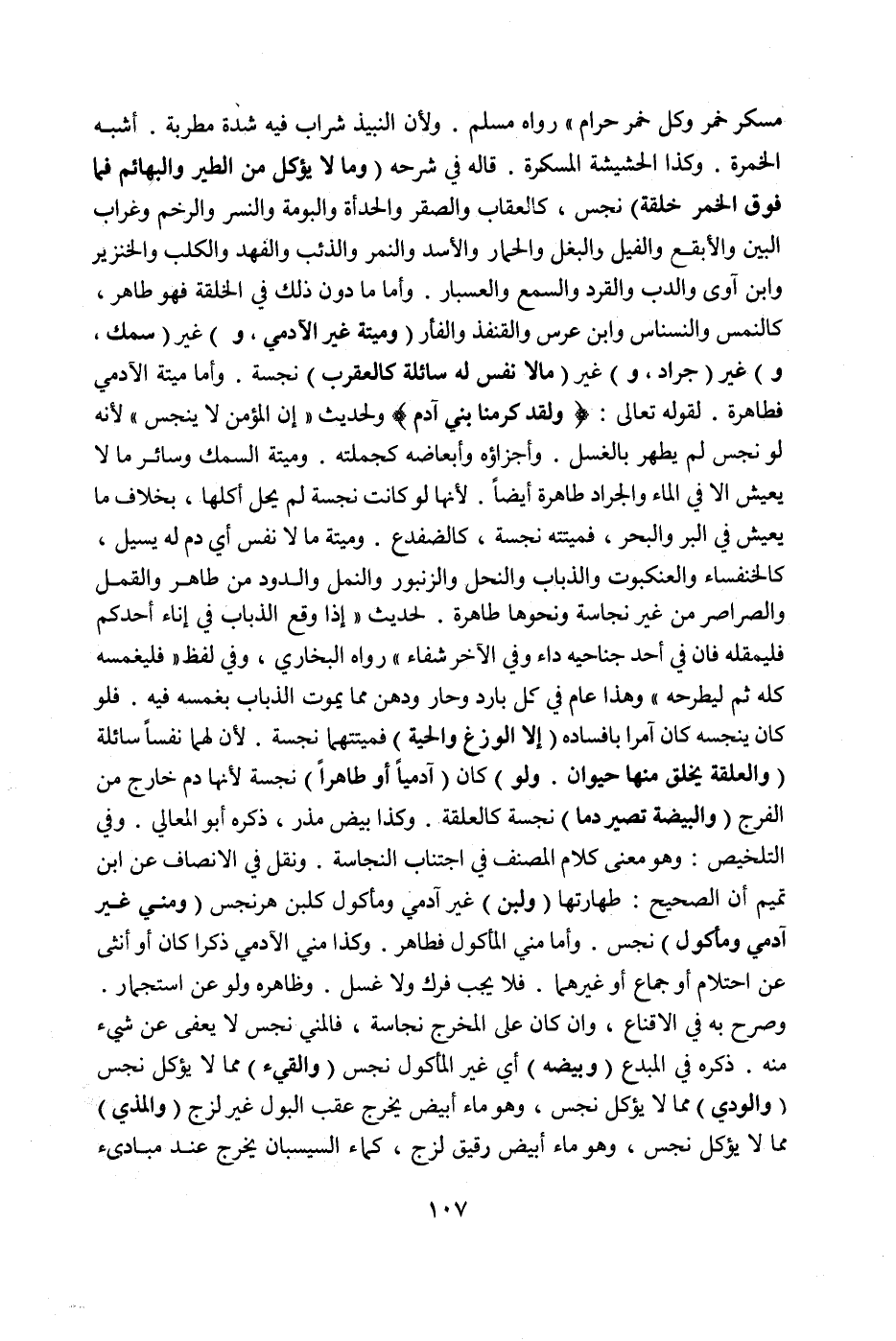 (وَمَيْتَةُ غَيْرِ الْآدَمِيِّ، وَ) غَيْرِ (سَمَكٍ، وَ) غَيْرِ (جَرَادٍ، وَ) غَيْرِ (مَا لَا نَفْسَ لَهُ سَائِلَةٌ كَالْعَقْرَبِ) نَجِسَةٌ. وَأَمَّا مَيْتَةُ الْآدَمِيِّ فَطَاهِرَةٌ. لِقَوْلِهِ تَعَالَى: {وَلَقَدْ كَرَّمْنَا بَنِي آدَمَ} [الإسراء: ٧٠] وَلِحَدِيثِ «إنَّ الْمُؤْمِنَ لَا يَنْجُسُ» لِأَنَّهُ لَوْ نَجِسَ لَمْ يَطْهُرْ بِالْغُسْلِ. وَأَجْزَاؤُهُ وَأَبْعَاضُهُ كَجُمْلَتِهِ. وَمَيْتَةُ السَّمَكِ وَسَائِرِ مَا لَا يَعِيشُ إلَّا فِي الْمَاءِ وَالْجَرَادِ طَاهِرَةٌ أَيْضًا. لِأَنَّهَا لَوْ كَانَتْ نَجِسَةً لَمْ يَحِلَّ أَكْلُهَا، بِخِلَافِ مَا يَعِيشُ فِي الْبَرِّ وَالْبَحْرِ، فَمَيْتَتُهُ نَجِسَةٌ، كَالضُّفْدَعِ.