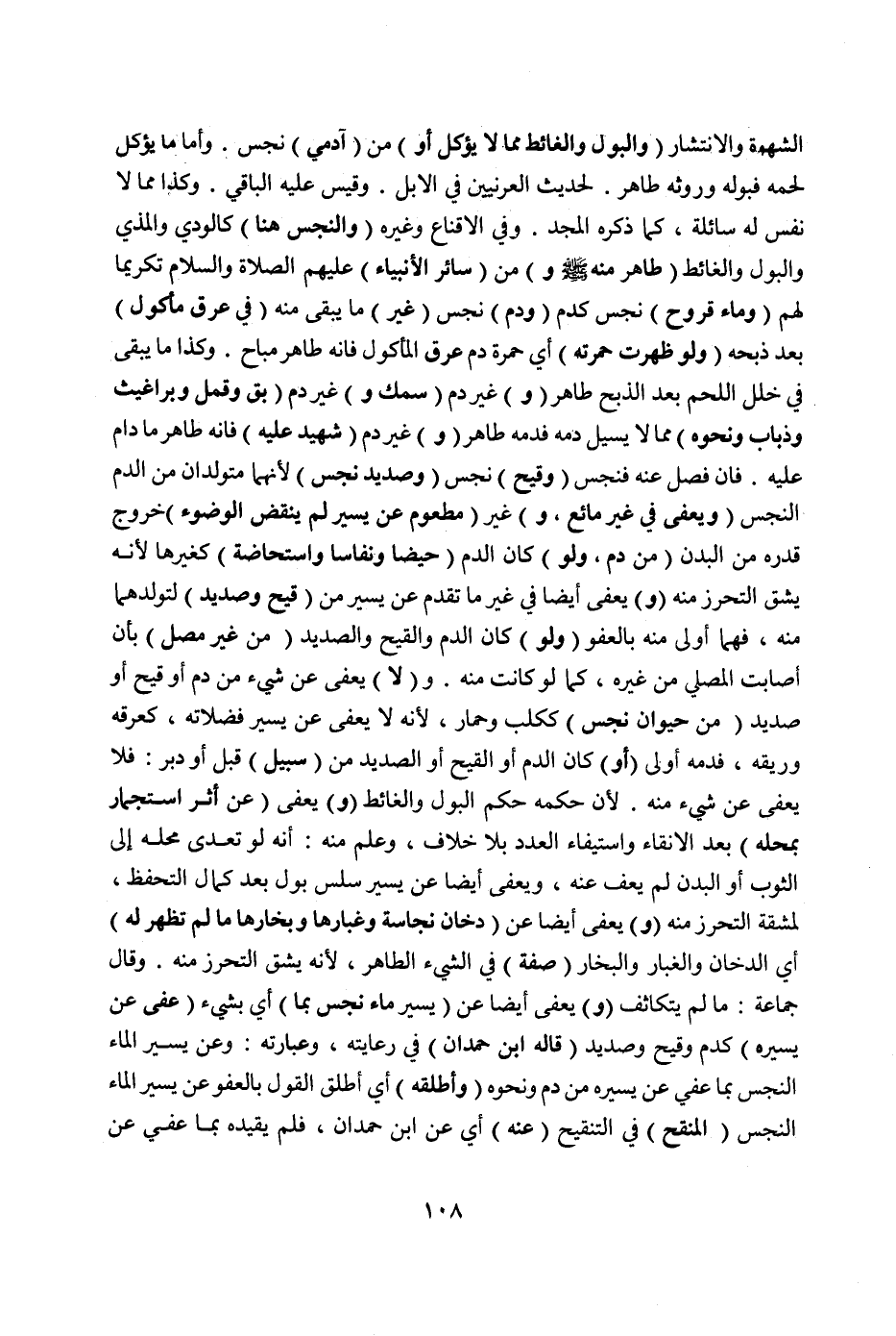 (وَمَاءُ قُرُوحٍ) نَجَسٌ كَدَمٍ (وَدَمٌ) نَجَسٌ (غَيْرِ) مَا يَبْقَى مِنْهُ (فِي عِرْقٍ مَأْكُولٍ) بَعْدَ ذَبْحِهِ (وَلَوْ ظَهَرَتْ حُمْرَتُهُ) أَيْ حُمْرَةُ دَمِ عِرْقِ الْمَأْكُولِ فَإِنَّهُ طَاهِرٌ مُبَاحٌ. وَكَذَا مَا يَبْقَى فِي خَلَلِ اللَّحْمِ بَعْدَ الذَّبْحِ طَاهِرٌ (وَ) غَيْرُ دَمِ (سَمَكٍ وَ) غَيْرُ دَمِ (بَقٍّ وَقَمْلٍ وَبَرَاغِيث وَذُبَابٍ وَنَحْوِهِ) مِمَّا لَا يَسِيلُ دَمُهُ فَدَمُهُ طَاهِرٌ (وَ) غَيْرُ دَمِ (شَهِيدٍ عَلَيْهِ) فَإِنَّهُ طَاهِرٌ مَا دَامَ عَلَيْهِ.