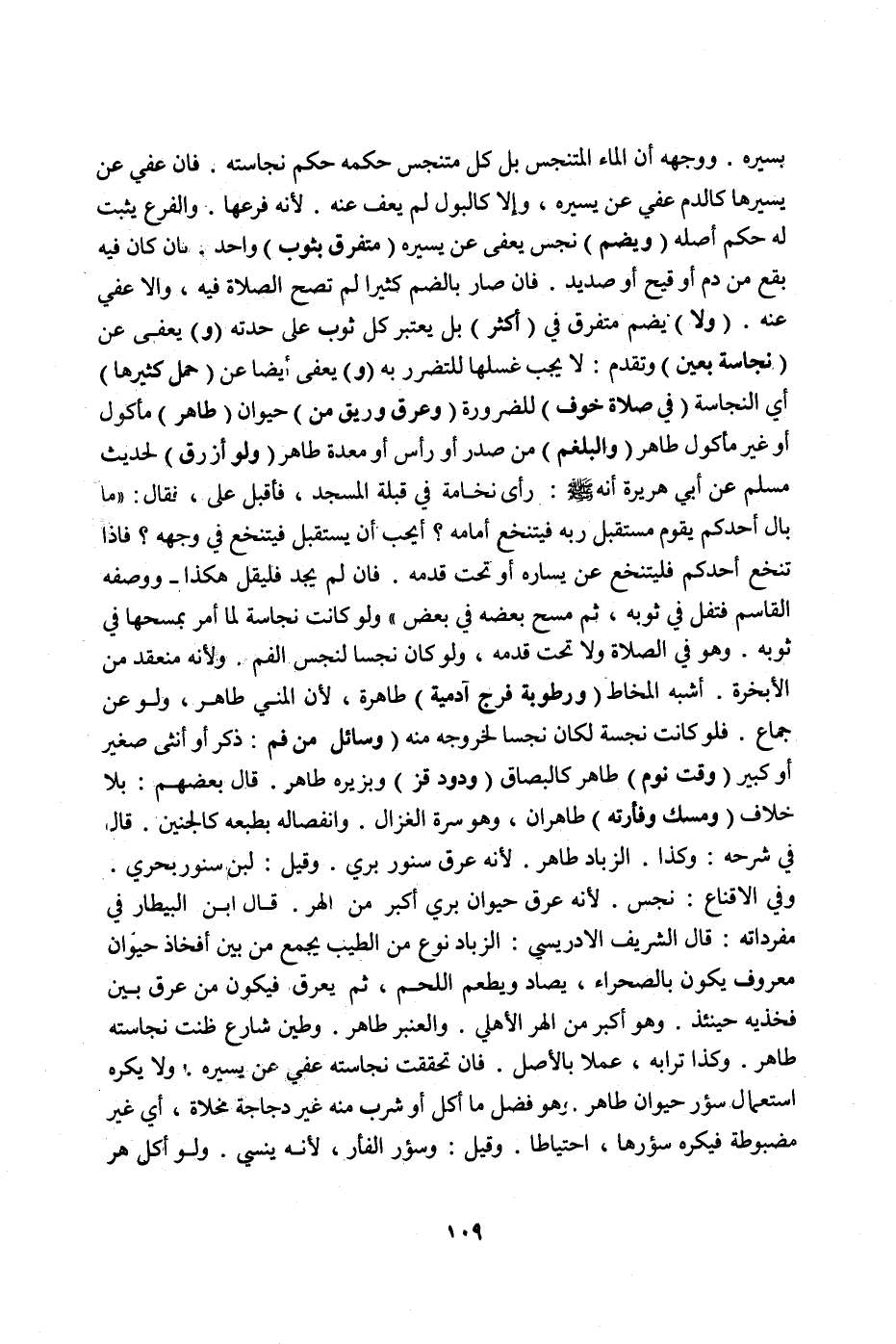 قَالَ ابْنُ الْبَيْطَارِ فِي مُفْرَدَاتِهِ: قَالَ الشَّرِيفُ الْإِدْرِيسِيُّ: (الزَّبَادُ) نَوْعٌ مِنْ الطِّيبِ يُجْمَعُ مِنْ بَيْنِ أَفْخَاذِ حَيَوَانٍ مَعْرُوفٍ يَكُونُ بِالصَّحْرَاءِ، يُصَادُ وَيُطْعَمُ اللَّحْمَ، ثُمَّ يَعْرَقُ فَيَكُونُ مِنْ عَرَقٍ بَيْنَ فَخِذَيْهِ حِينَئِذٍ. وَهُوَ أَكْبَرُ مِنْ الْهِرِّ الْأَهْلِيِّ. (وَالْعَنْبَرُ) طَاهِرٌ، وَطِينُ شَارِعٍ ظُنَّتْ نَجَاسَتُهُ طَاهِرٌ. وَكَذَا تُرَابُهُ، عَمَلًا بِالْأَصْلِ. فَإِنْ تَحَقَّقَتْ نَجَاسَتُهُ عُفِيَ عَنْ يَسِيرِهِ،