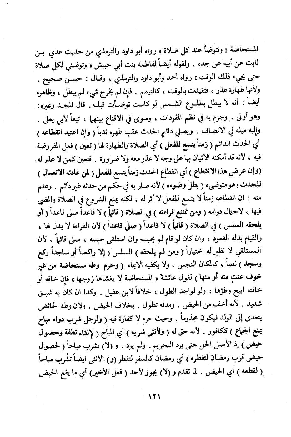الْمُسْتَحَاضَةِ «وَتَتَوَضَّأُ عِنْدَ كُلِّ صَلَاةٍ» رَوَاهُ أَبُو دَاوُد وَالتِّرْمِذِيُّ مِنْ حَدِيثِ عَدِيِّ بْنِ ثَابِتٍ عَنْ أَبِيهِ عَنْ جَدِّهِ.